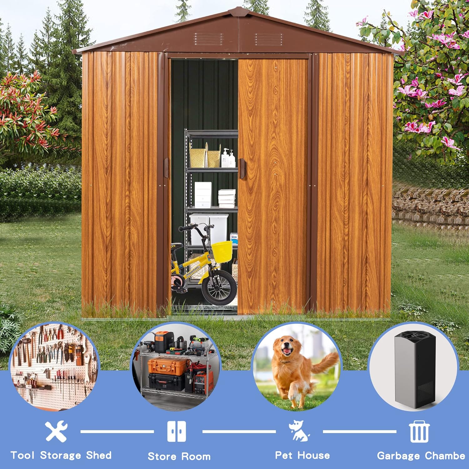 6x6 FT Outdoor Storage Shed, Metal Garden Shed with Frame Floor, Outside Tool Shed with Lockable Sliding Doors, Waterproof Storage Building with Sloped Roof for Backyard, Patio, Lawn, Coffee