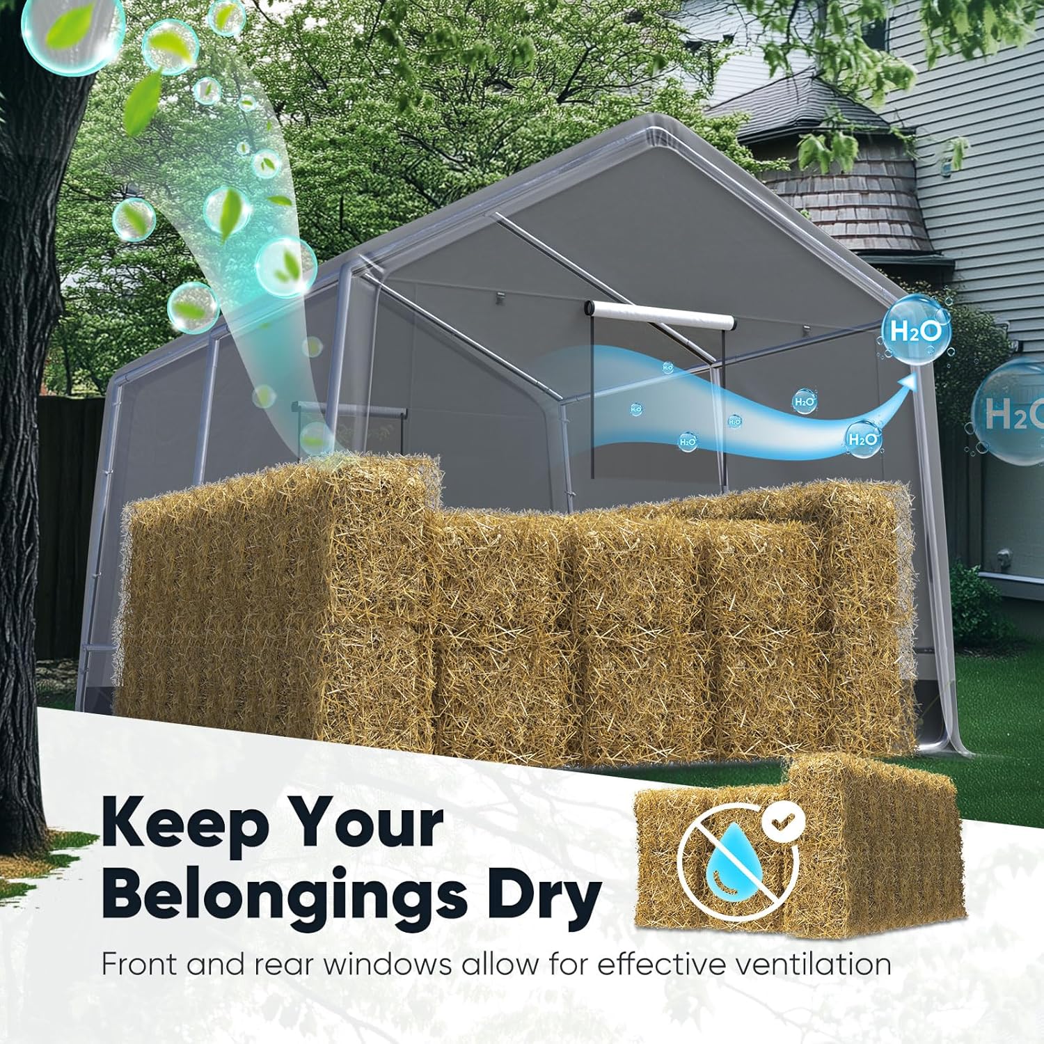 - 【Roll-up Ventilation Windows Design】There are 1 mesh roll-up windows on each door + ceiling airflow channel prevent condensation buildup. ideal for storage Lawn mower and other tools.