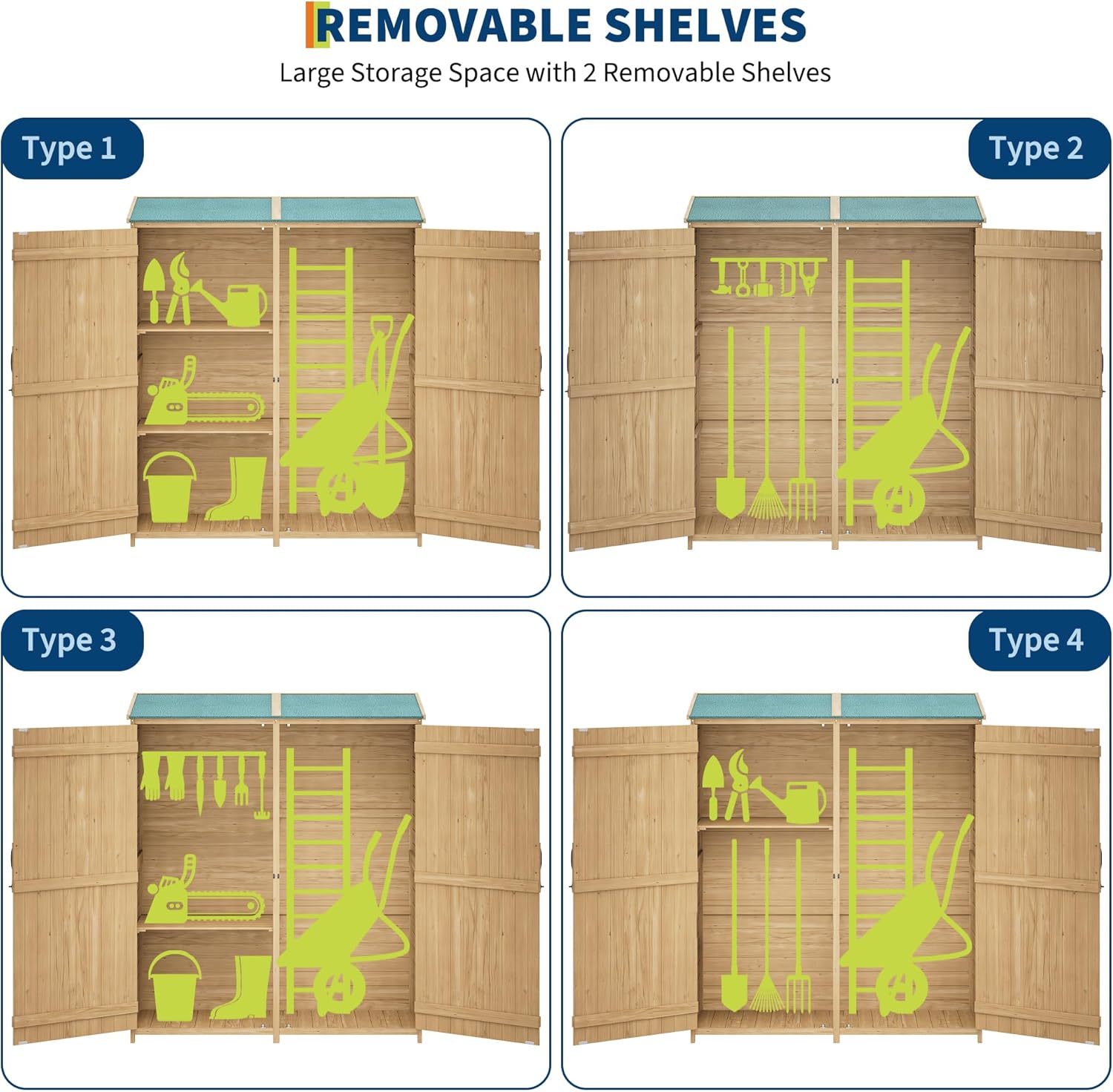 Wooden Outdoor Storage Cabinet, 64" Vertical Tall Garden Tool Shed with Waterproof Sloped Roof, Lockable Double Doors, Removable Shelves, Utility Tool Organizer for Patio, Backyard, Lawn Equipment