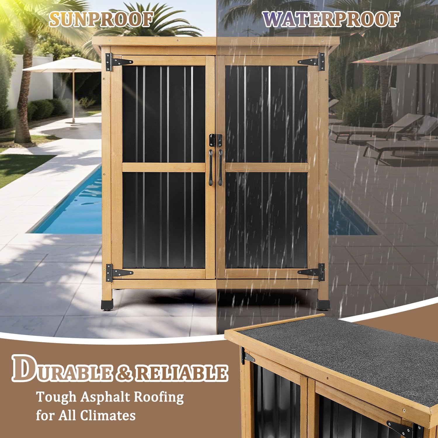 - Secure & Weatherproof: This outdoor storage cabinet waterproof comes with lockable doors and strong magnets for security. The asphalt roof shields against rain, snow, and UV rays—ideal for garden storage cabinets or patio storage cabinet use