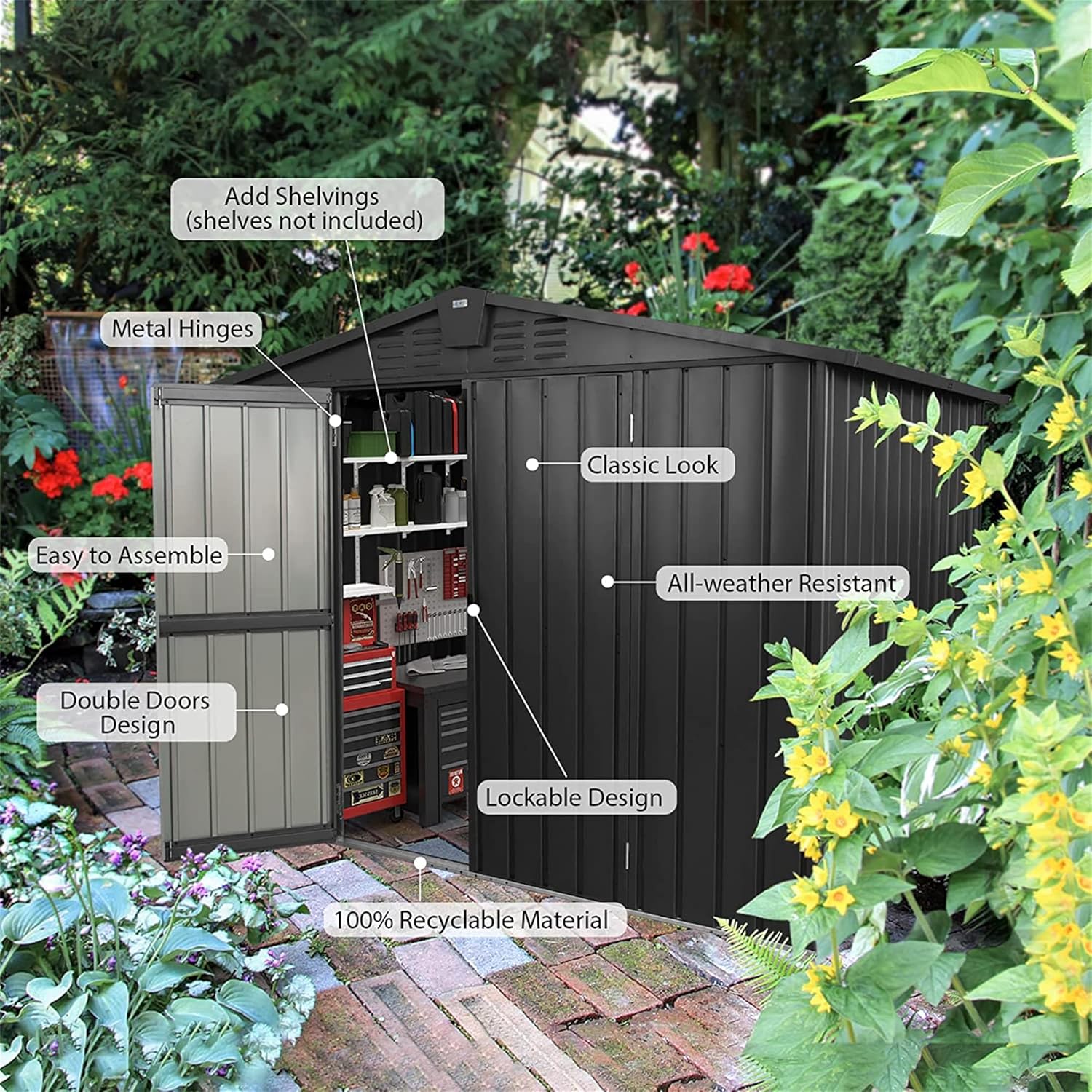 - Spacious & Organized Storage Capacity This shed provides ample space for lawnmowers, bicycles, patio furniture, and more. The intelligently designed interior accommodates shelves or hooks (not included), while wide double doors ensure easy access for bulky items. Say goodbye to cluttered garages and hello to a neatly organized backyard