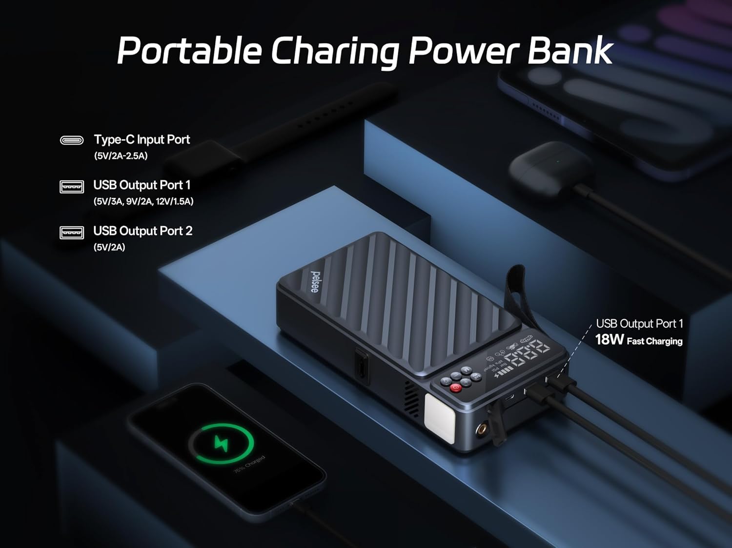 - 12 Safety Protections & 18W Fast Charge- Equipped with two output ports(USB Output Port 1-18W), Portable car battery jump starter can charge various electronic devices efficiently. 12 safety protection(Spark protection,reverse polarity etc)and multiple safety warnings provide greater security for your journey (Note: When the internal temperature reaches 95β during inflation, it will enter overheat protection and shut down. Please wait for it to cool down before continuing to use it)