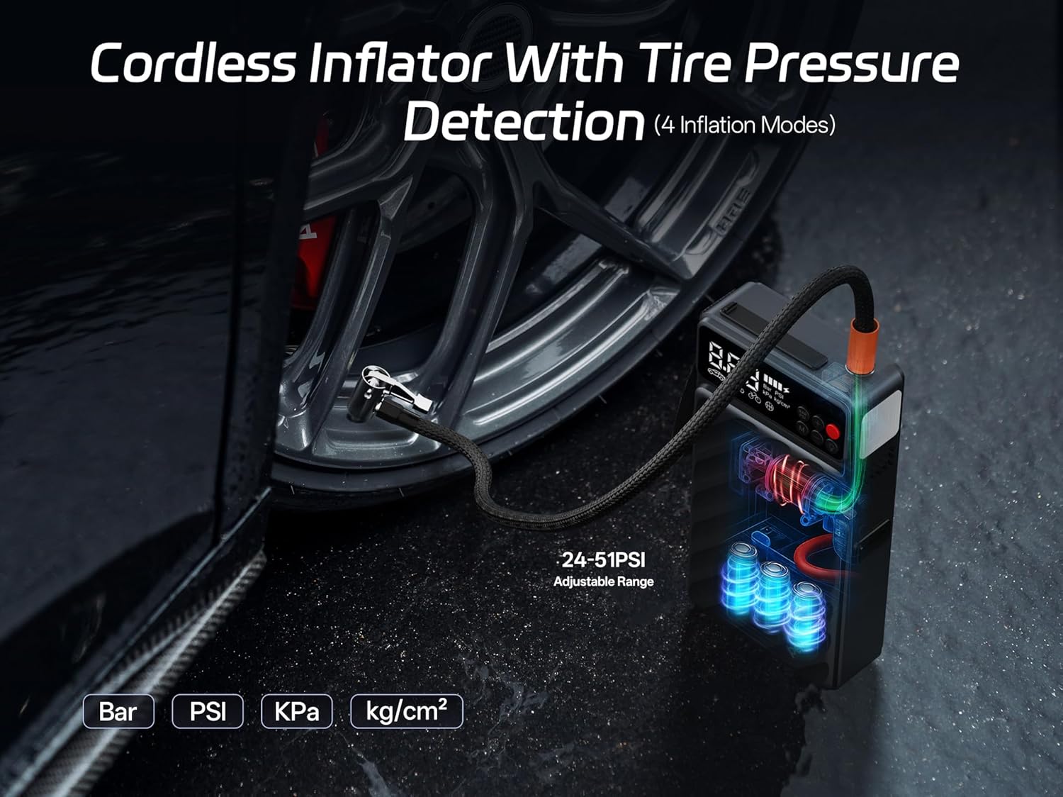 - Jump Starter with Air Compressor- Equipped with a 160PSI high-efficiency turbocharger system. Supports intelligent detection of tire pressure and automatic shutdown after 30 seconds of static rest. Equipped with 4 inflation modes(Bar,PSI,KPa,kg/cmΒ²), making quick work of insufficient tire pressure