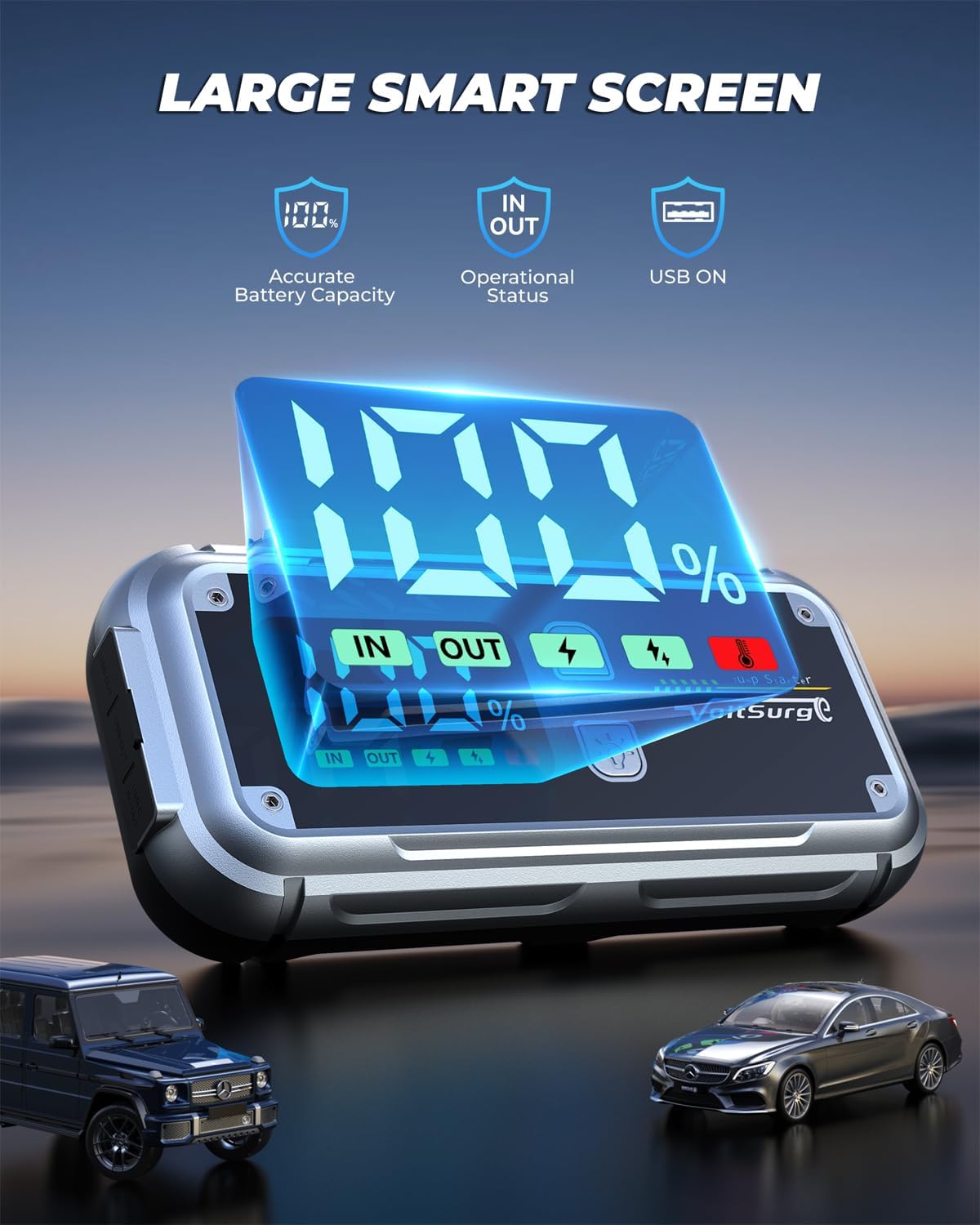- 5000A battery pack power supply:VoltSurge car battery charger with 5000A peak, safely start the 12V vehicles in seconds with this booster(up to All Gas 8.0L Diesel Engine), up to 50 jump starts on a single charge. It is suitable for cars, trucks, motorcycles, boats, RVs, tractors, lawnmowers, snowmobiles, etc