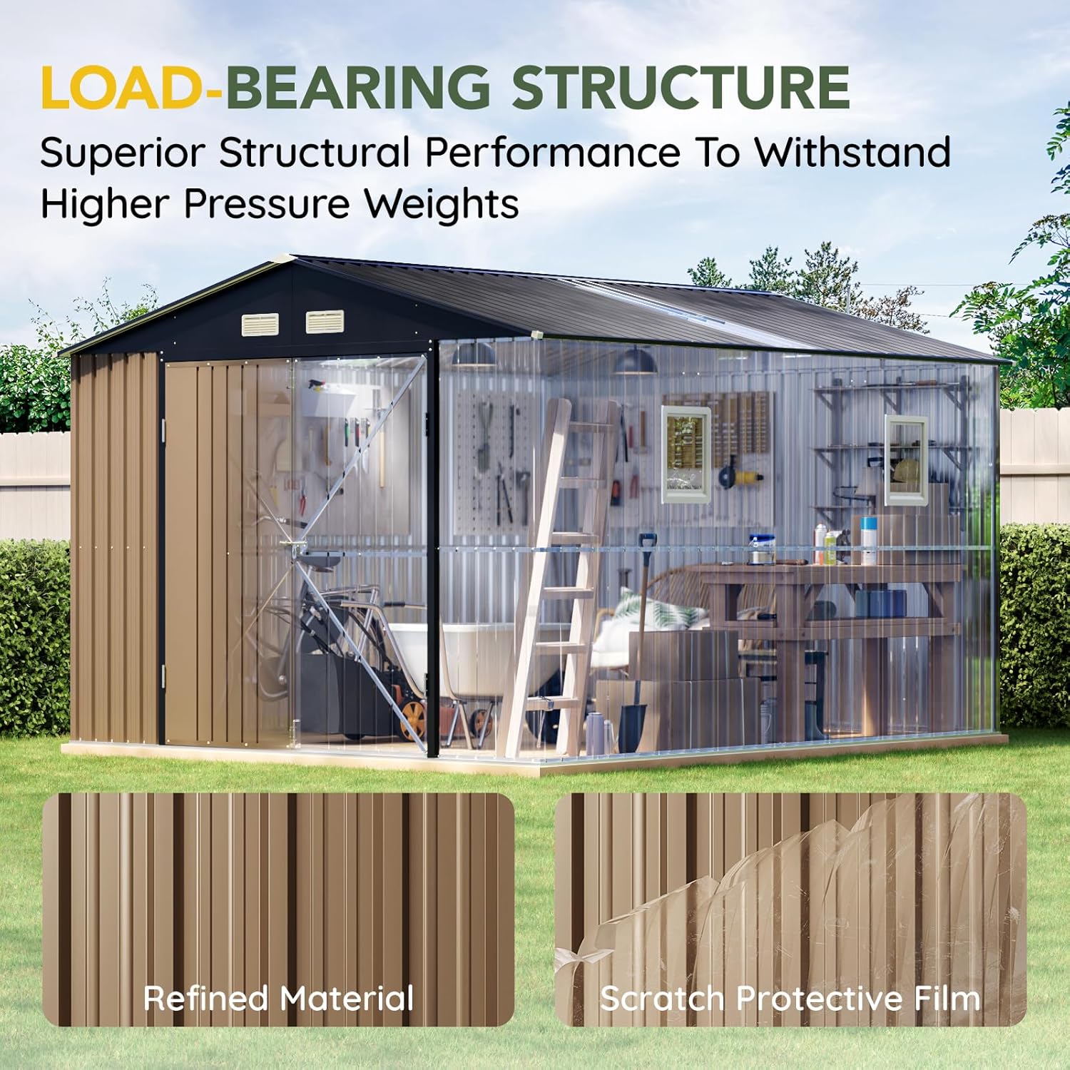 Breezz Outdoor Storage Shed 10 x 12ft. Utility Tool Shed Metal Storage Garden Shed with Lockable Doors, Windows & Metal Frame Floor for Patio Storage,Brown