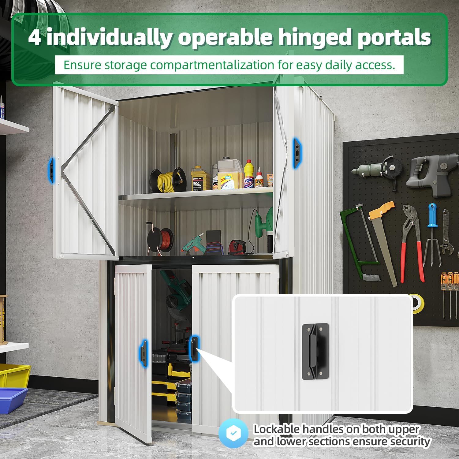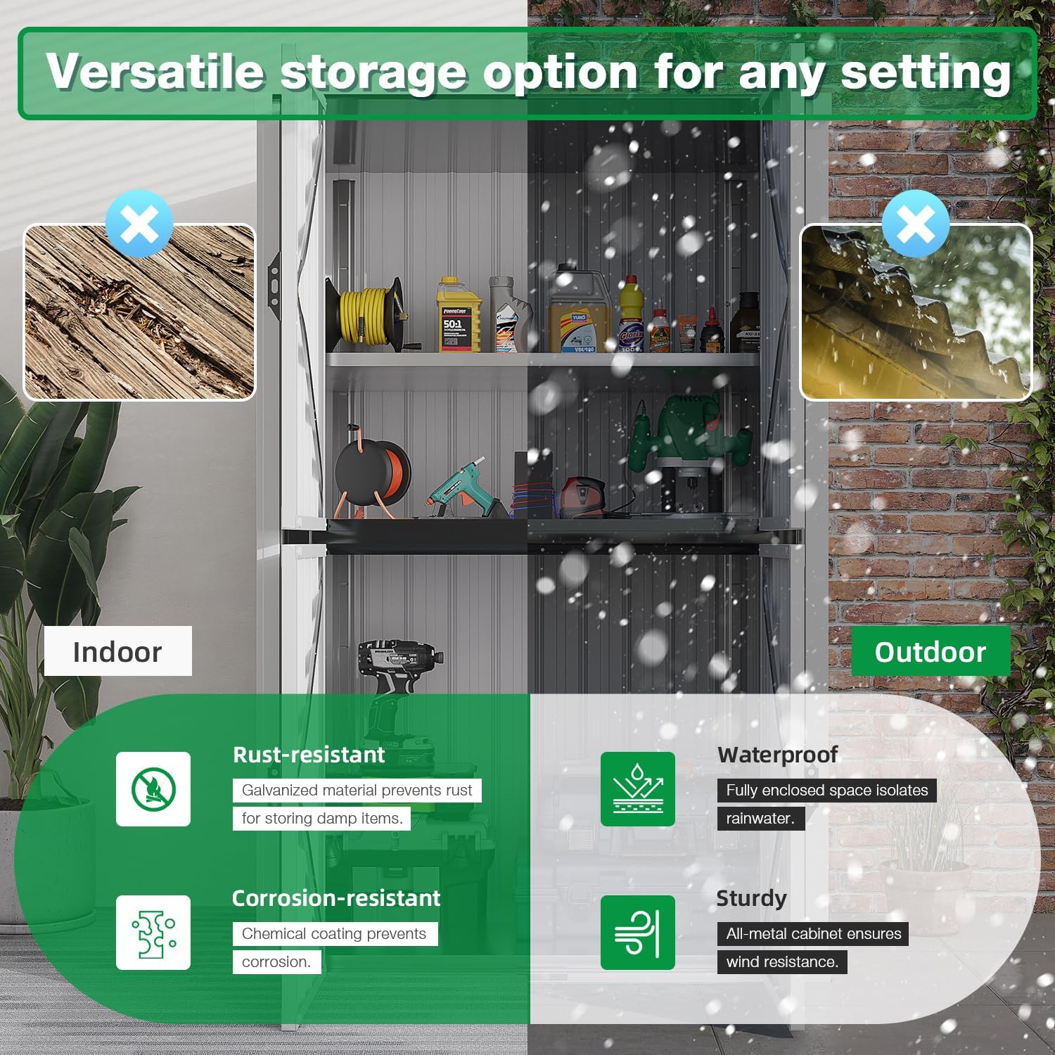 - Weatherproof Outdoor Cabinet: Fully sealed for outdoor storage waterproof protection and made from high-quality metal, weighing 95 lbs and capable of withstanding strong winds. It combines the benefits of traditional wooden and resin sheds, making it suitable for both indoor and outdoor use.
