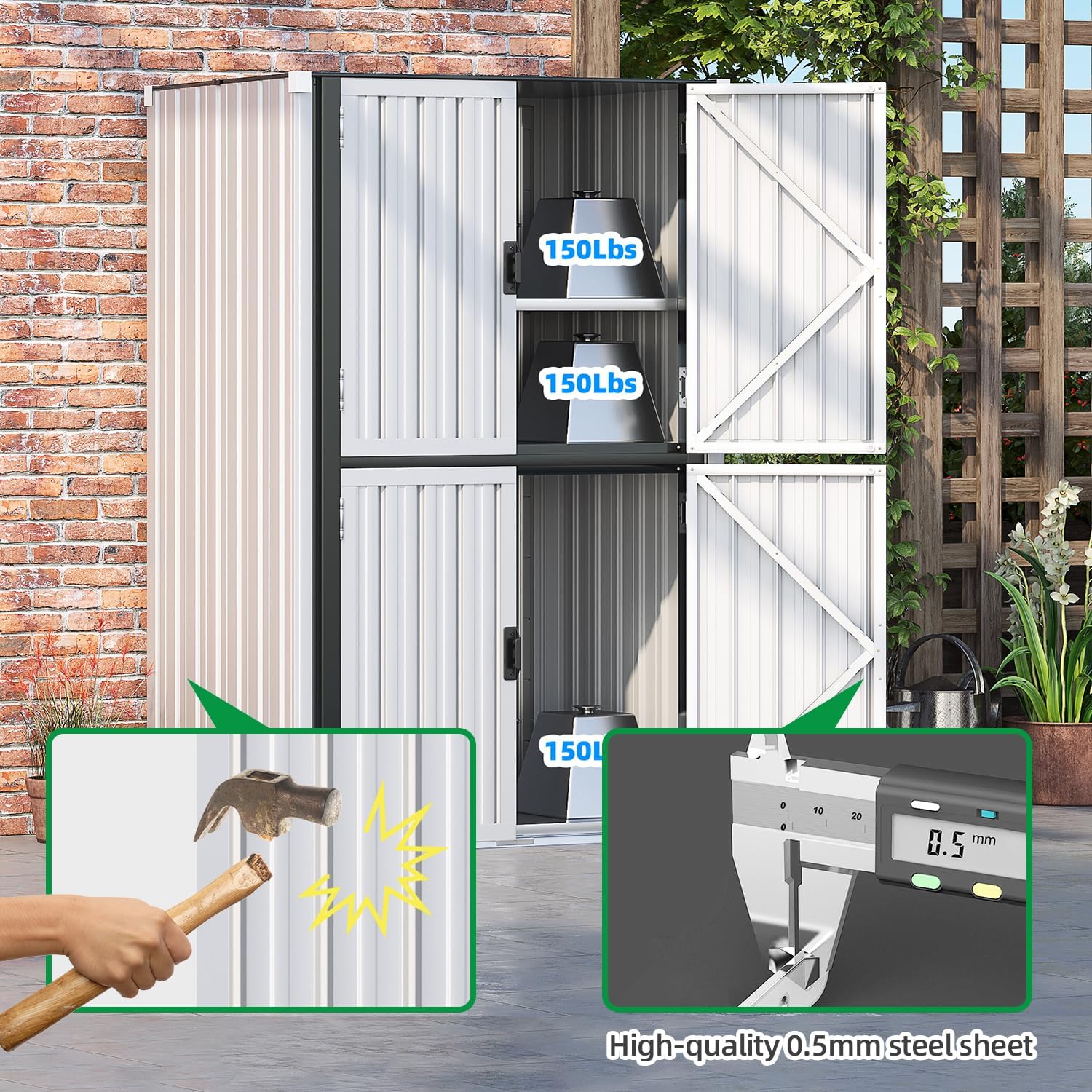 - High Weight Capacity: Each shelf in this tall outdoor storage cabinet can support up to 150 lbs, providing robust and durable storage. The eco-friendly powder coating is scratch-resistant and rustproof.