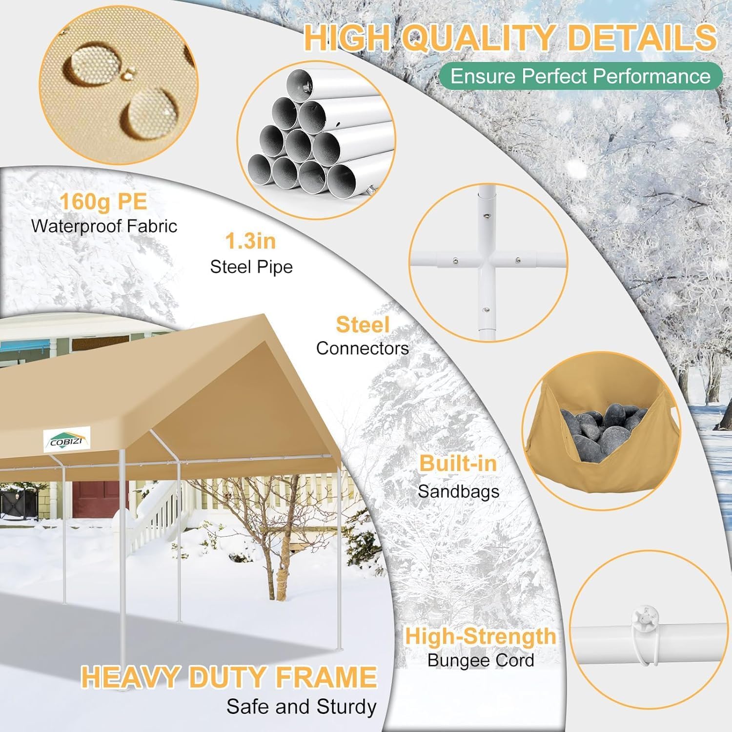 COBIZI 12x20ft Carport Heavy Duty, Portable Car Garage Outdoor Party Tent with Built-in Sandbags, Waterproof Car Canopy for Truck, Boat, SUV with All-Season Tarp, Khaki