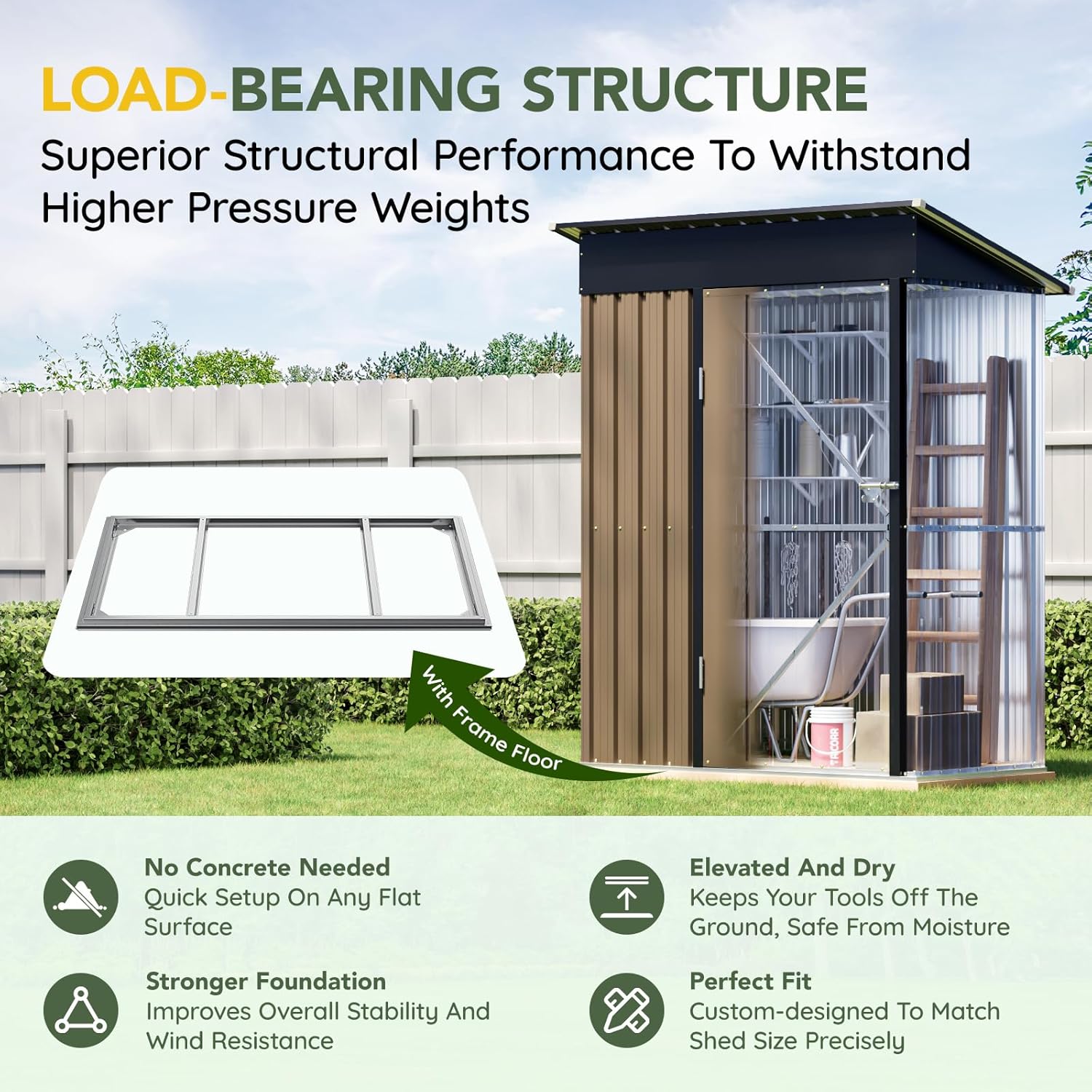 - Includes Reinforced Steel Base Frame – Comes with a pre-engineered steel base that provides a stable and level foundation, making installation easier and enhancing the shed’s overall structural integrity. Simply add plywood or concrete blocks on top for a complete floor.