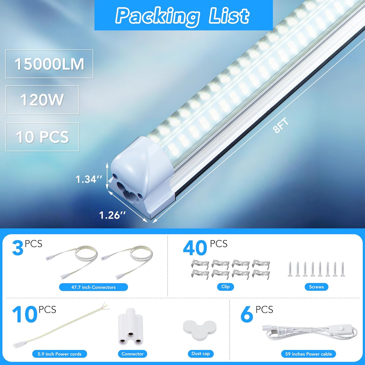 10 Pack 8FT T8 LED Shop Lights, 120W Integrated Tube Light, 19200LM 6000-6500K Daylight, Linkable Lighting, Plug & Play Energy-Saving Commercial Bay Lighting Garage Warehouse Basement (V4)
