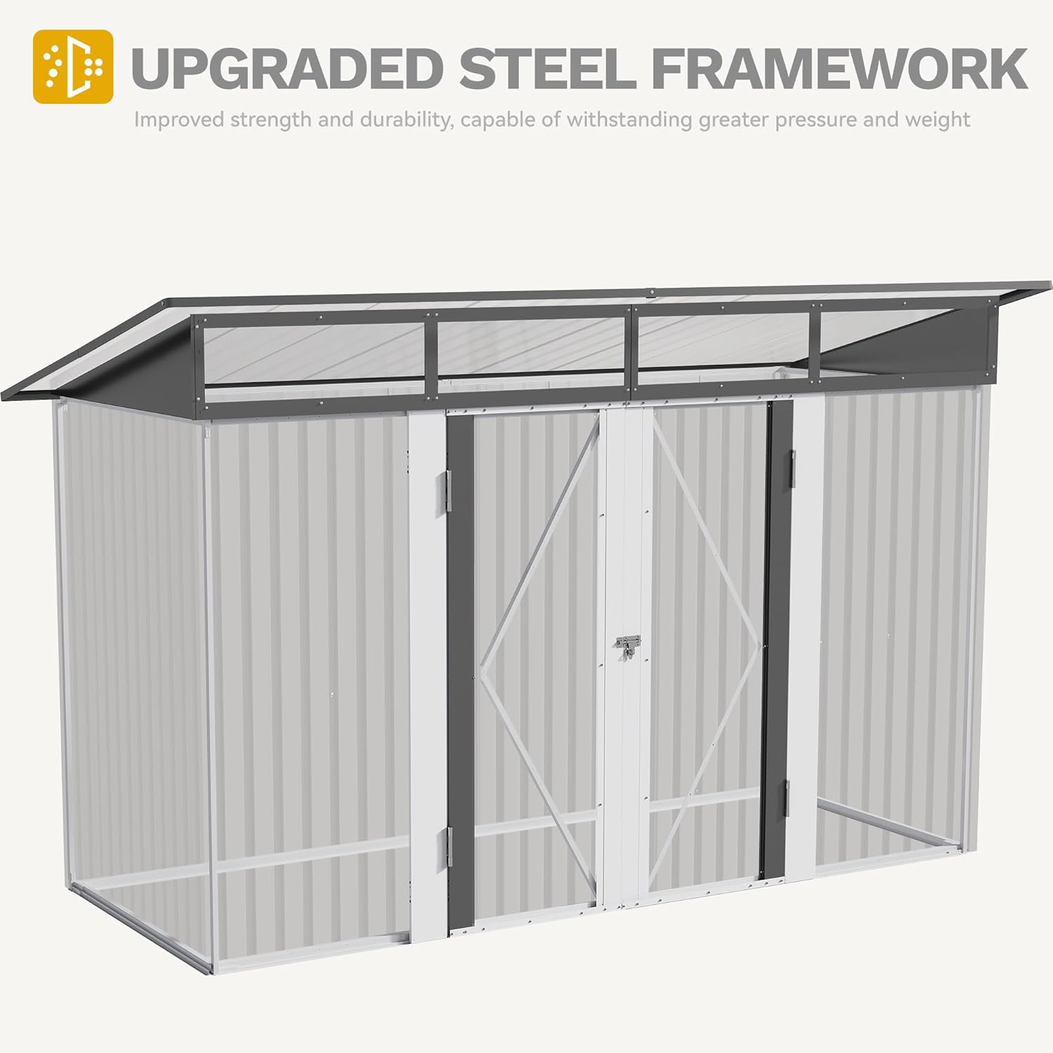 - Long-lasting Durability: Made with electro-galvanized steel and protective paint, this outdoor storage shed resists rust and UV damage, staying strong in any climate, including rain, snow, and sunlight; Its all-metal design keeps water out, suitable for delicate items