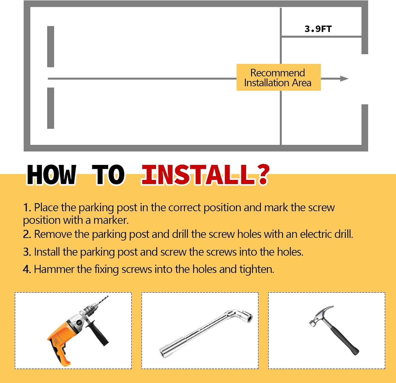 - Highly Visible Design for Safety: the parking barrier is treated with a high-temperature spray-painted finish with a vibrant yellow color and red reflective stickers; This enhances its visibility, especially at night, ensuring that the parking post remains conspicuous under low-light conditions; Such visibility contributes significantly to safety by ensuring drivers can easily spot the post even from a distance