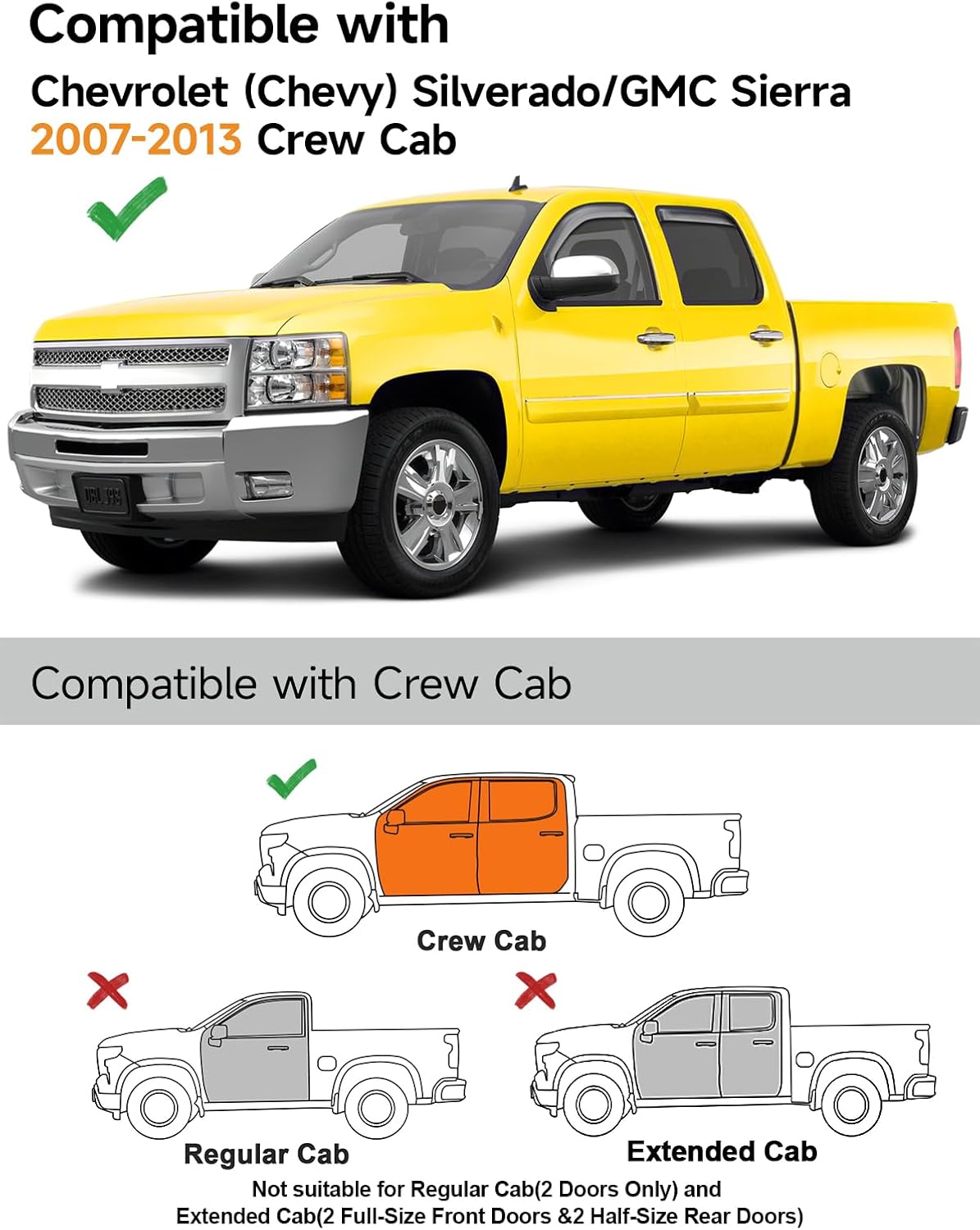 - ăCompatibilityăThe Deejecsun Window Rain Guards weather tech suitable for Truck Chevrolet (Chevy) Silverado/GMC Sierra Crew Cab 2007 2008 2009 2010 2011 2012 2013 Warning:Not suitable for Regular Cab(2 Doors Only) and Extended Cab(2 Full-Size Front Doors &2 Half-Size Rear Doors)