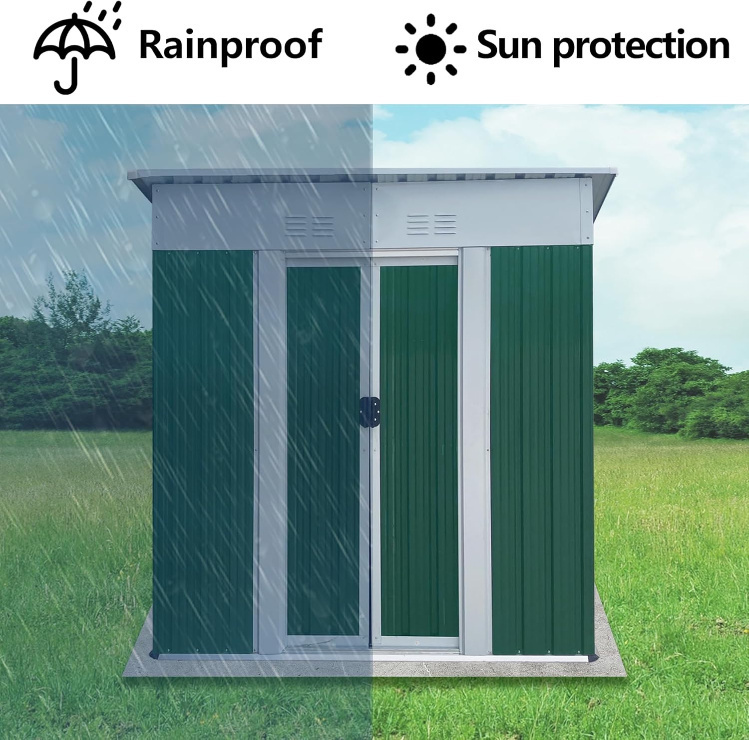 5x3 FT Outdoor Storage Shed with Sloping Roof, Waterproof Metal Garden Sheds w/Lockable Sliding Doors and Vents, Weather Resistant Tool Storage House for Backyard, Patio, Lawn, Green