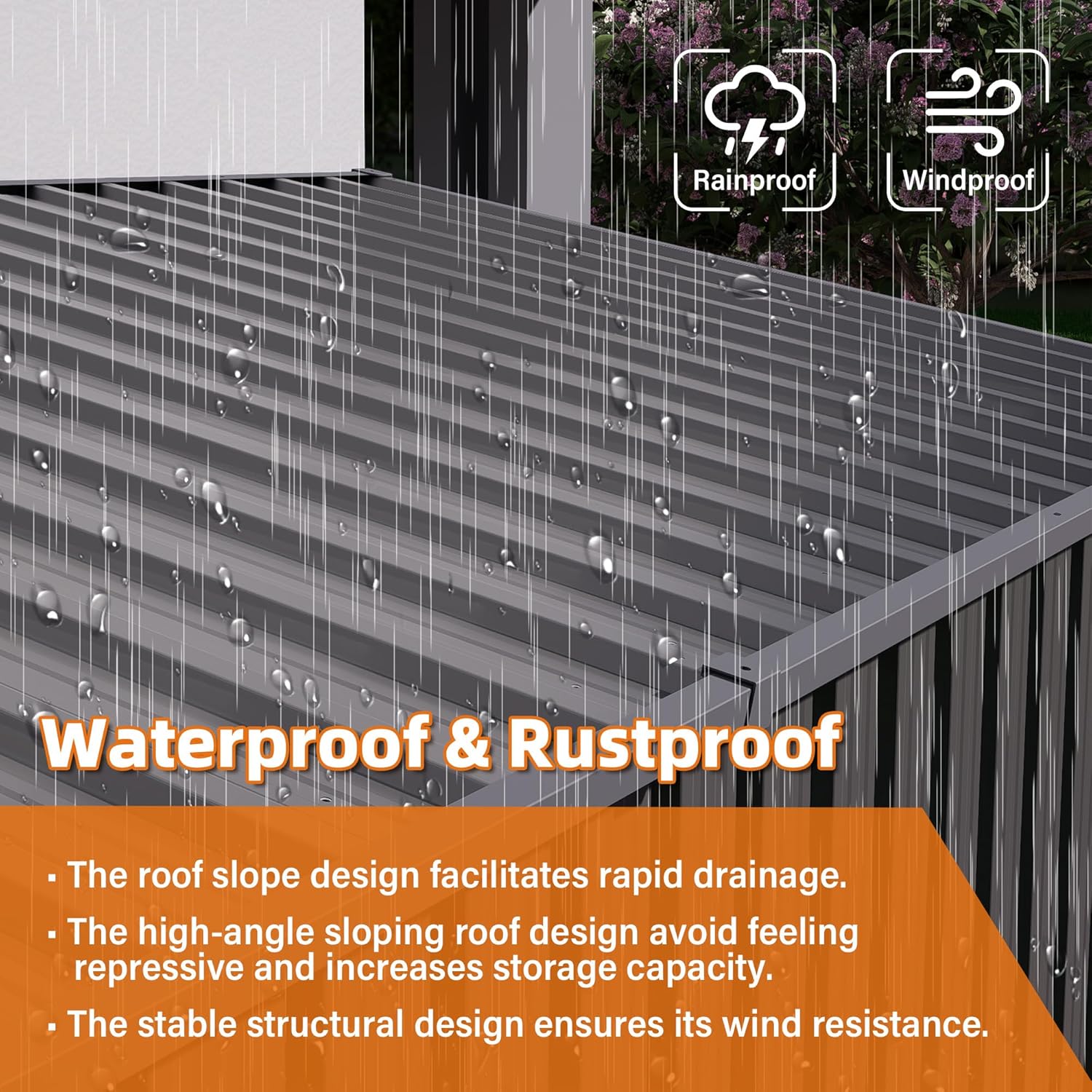 - Built to Last with Premium Steel - We've built this outdoor shed using top-quality, tough galvanized steel. It's designed to resist water, rust, and UV damage, ensuring it looks great and lasts for years. You can count on its sturdy build to stay put even in strong winds, and it can handle a decent amount of snow in winter too.