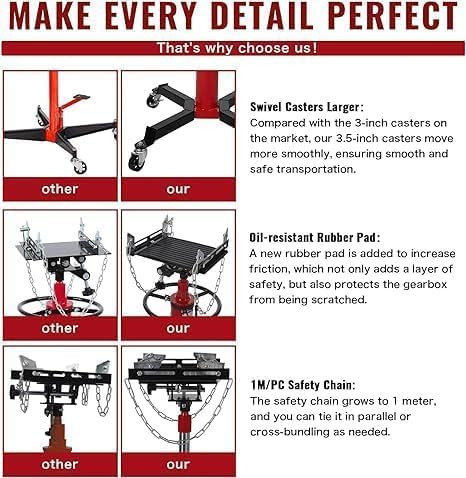 - Premium Steel Construction:Built to last, this transmission jack features a welded steel frame that resists wear and tear under heavy daily use. Perfect for garages, repair shops, and industrial environments, its rugged design guarantees long-term reliability and durability.