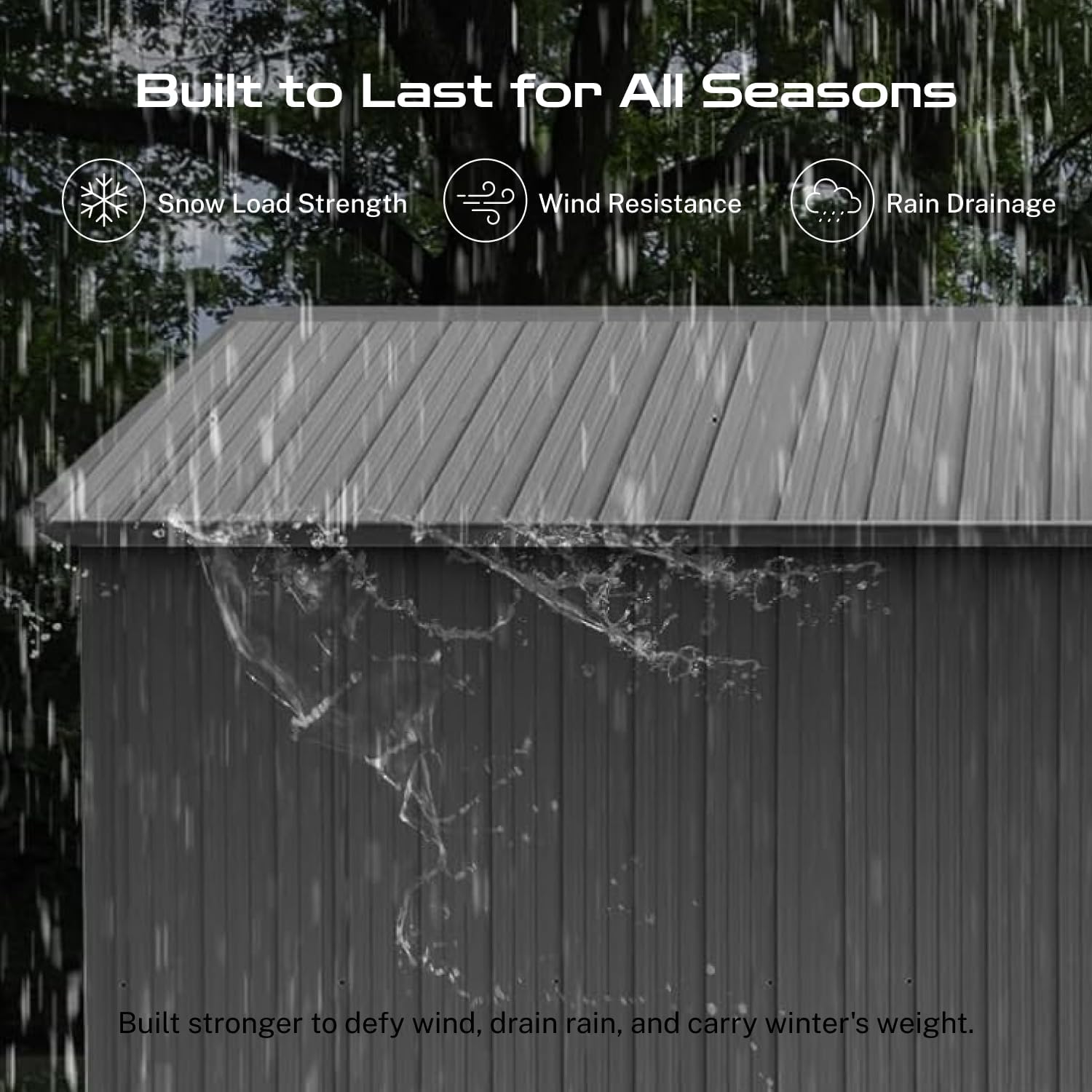 - β [Sloped Roof for Superior Weather Protection] Designed for real-world conditions, the efficient sloped roof system guarantees optimal rainwater drainage, preventing damaging pooling and leaks. This key feature in our storage buildings and sheds clearance design minimizes maintenance and ensures your tools, equipment, and belongings stay consistently dry inside