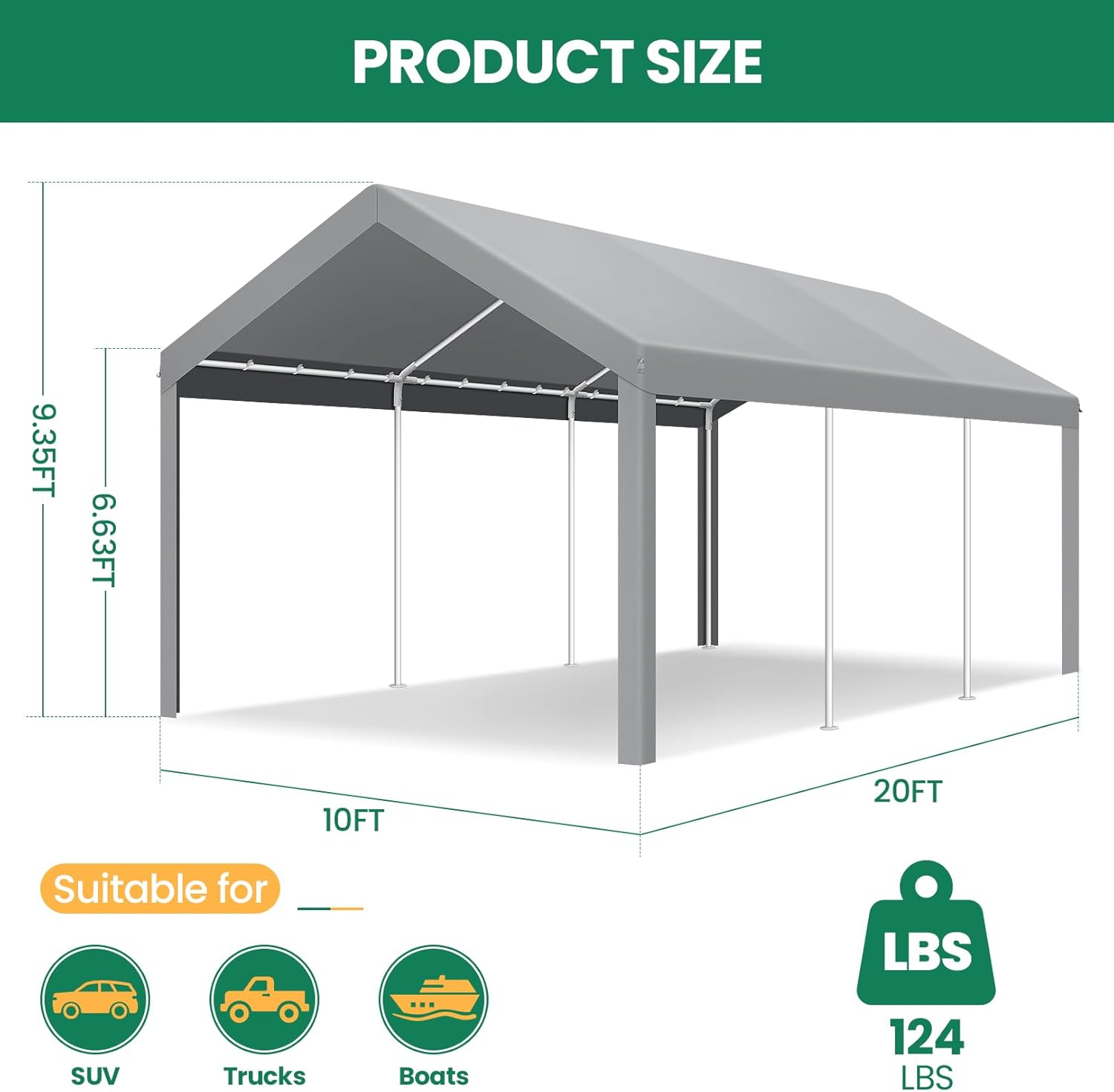 - 【Easy Setup】 The 10x20 heavy-duty carport comes with protective packaging and an easy-to-follow manual, allowing two people to set it up in under an hour. For any installation or usage inquiries, feel free to contact us.