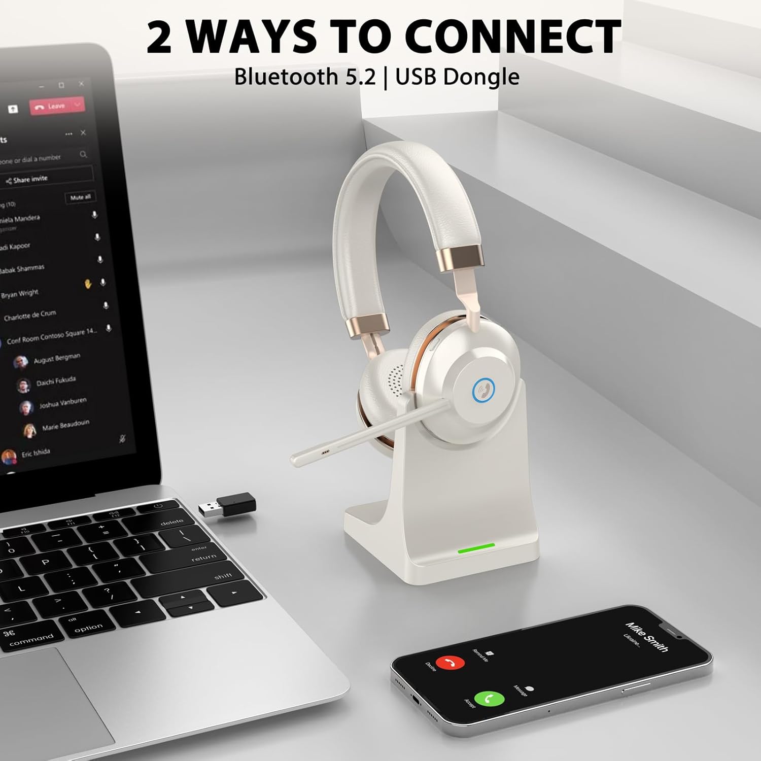 - 【DUAL-DEVICE CONNECTIVITY & USB DONGLE】This wireless headset with advanced Bluetooth 5.2 enables seamless switching between paired devices without reconnection. The included USB dongle of wireless headphones extends compatibility to non-Bluetooth devices, delivering stable, long-range connectivity up to 15m (49ft) for uninterrupted communication.