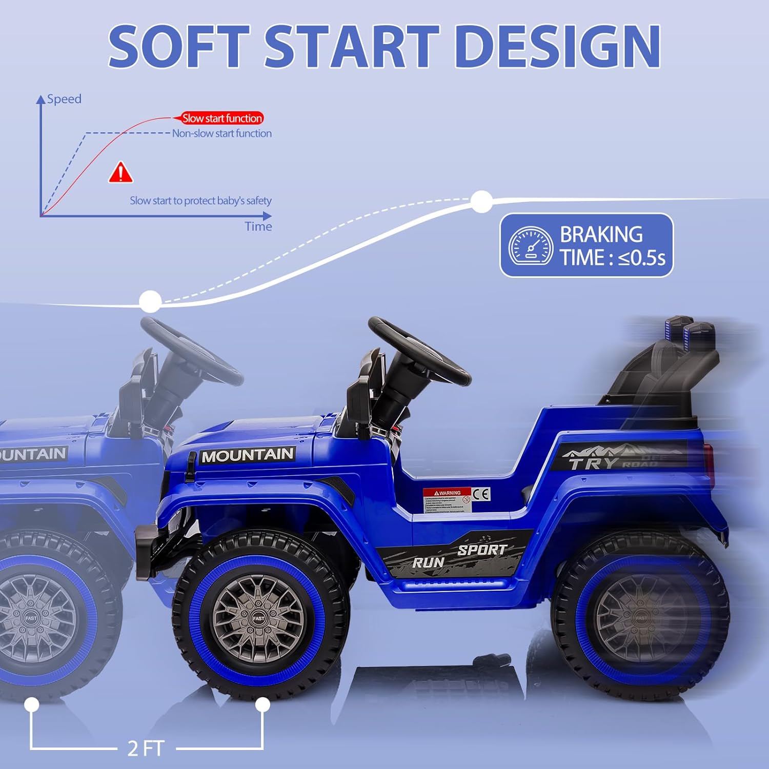 - The Perfect Choice for Kids: Designed with a slow-start function and sturdy seat belts, this kids ride on car ensures a safe and fun driving experience for children. Itโs the perfect companion for their every day. OVERALL DIMENSIONS: 38"(L) x 24"(W) x 24"(H); WEIGHT CAPACITY: 66 lbs.
