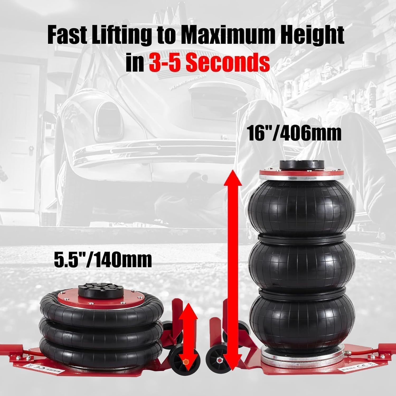 - Portable:This air jack adopts a lightweight design, with light weight and small size, and can be easily stored in the trunk of the car or the tool box. The unique folding structure makes it take up very little space, and it is equipped with a special storage bag for easy carrying in the car. Whether it is daily driving or long-distance self-driving, it can be used at any time to ensure a quick response in an emergency. It is an ideal travel equipment for car owners.