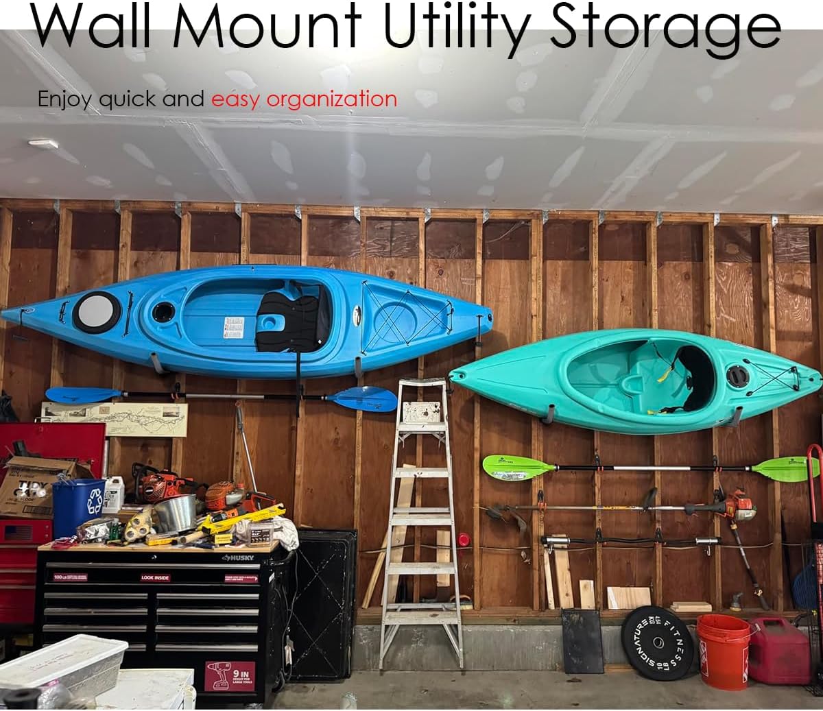 - PACKAGE INCLEDE - 6 Pieces wall mount J Utility kayak Hooks, 6 Expansion bolts, 13 screws and 13 anchors Sufficient accessories. These are exactly what you needed to keep the kayaks off the floor. keep your garage or outdoor storage area organized while securely holding various bulky items
