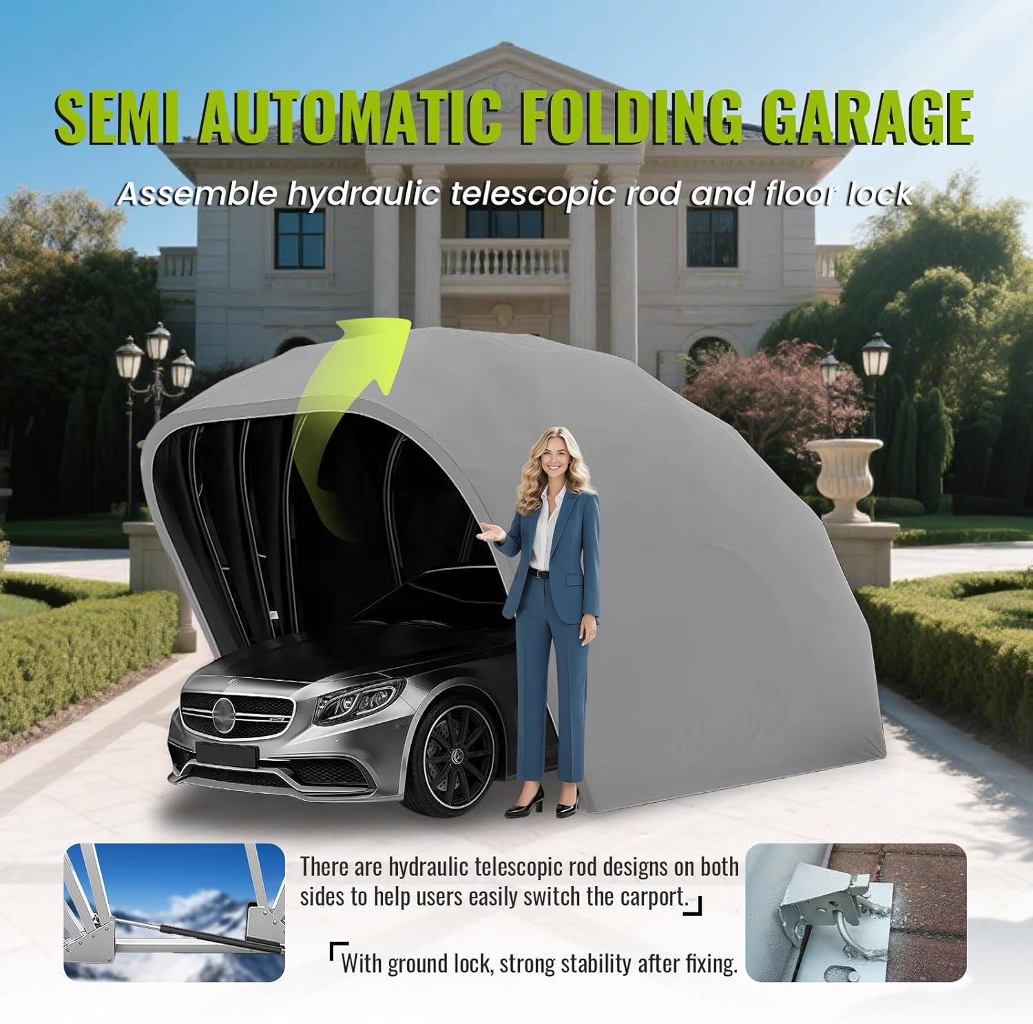 - Semi-automatic Carport: Aerodynamics ,The most scientific arc design Reduce air resistance, enhance wind resistance, and achieve the best protection effect.The spacious design makes the carport suitable for many different types of vehicles, including cars, SUVs, motorcycles and more.