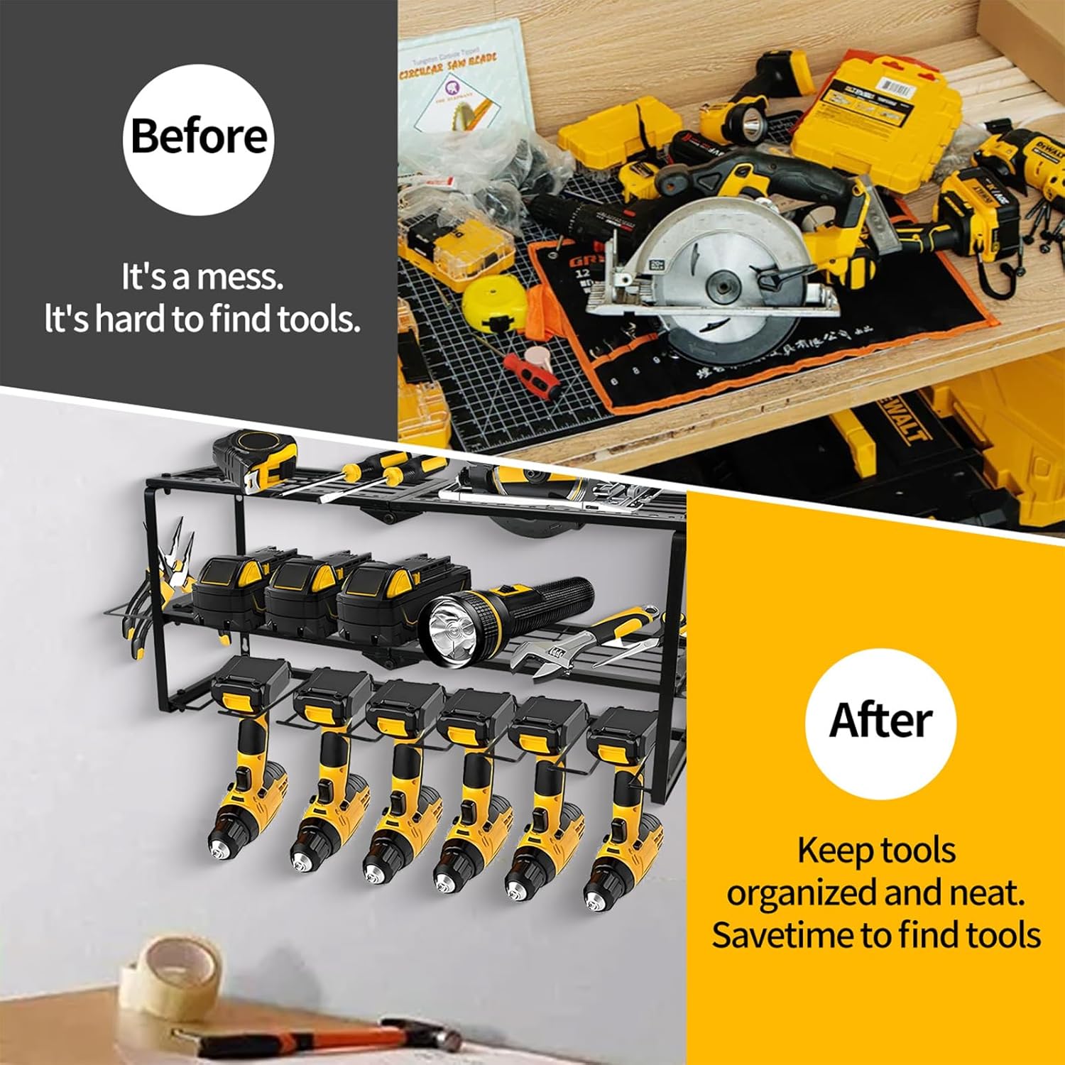 - [Wall Mount Power Tool Organizer] - 3 layer design, there are more space for battery packs, Features 7 cordless drill holders, each tool has it's own place, no need to look around any more. Helps organize your workspace.