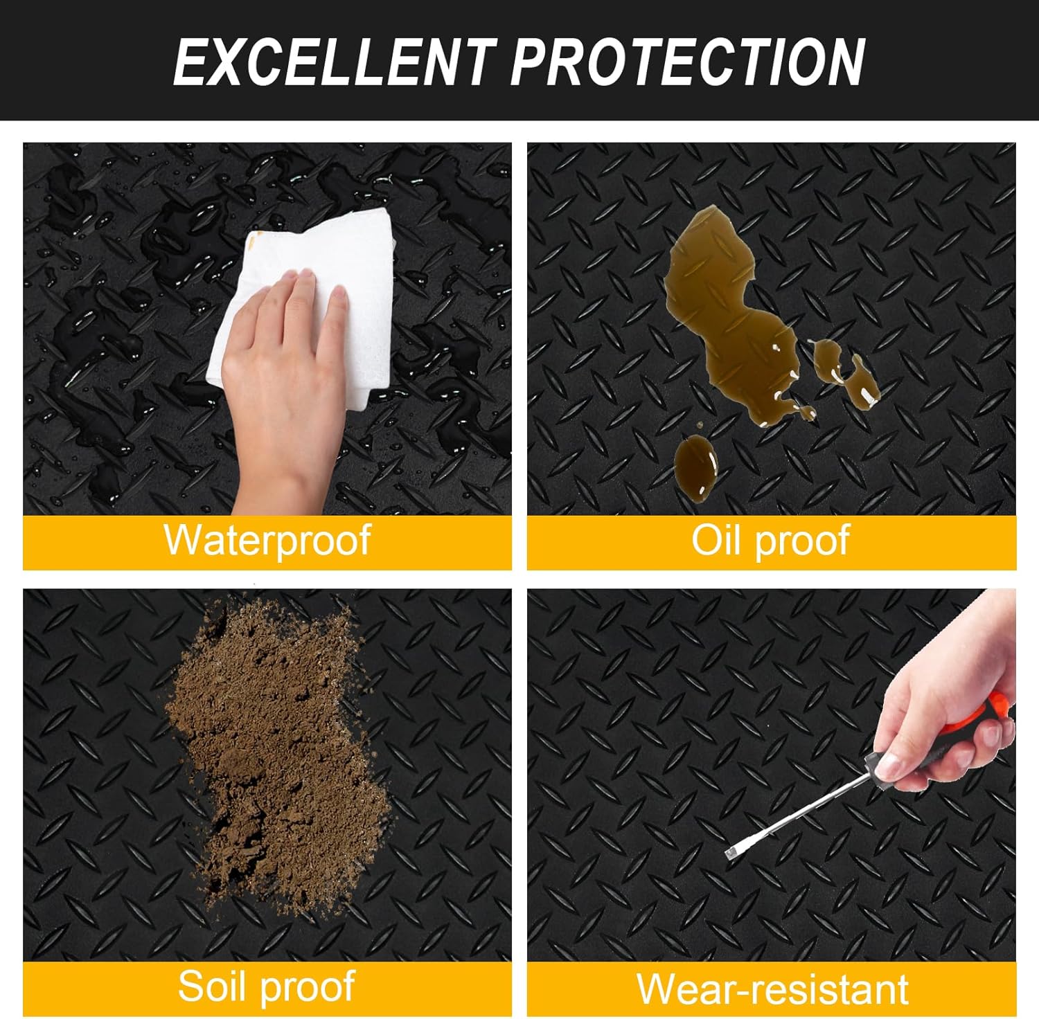 - Anti-Slip Design: The under car mat engineered with a diamond plate texture for superior slip resistance, ensuring safety for both foot traffic and parked vehicles even in damp conditions.In order to make the mat does not slip, you can use double-sided tape on all sides(not included in the package)