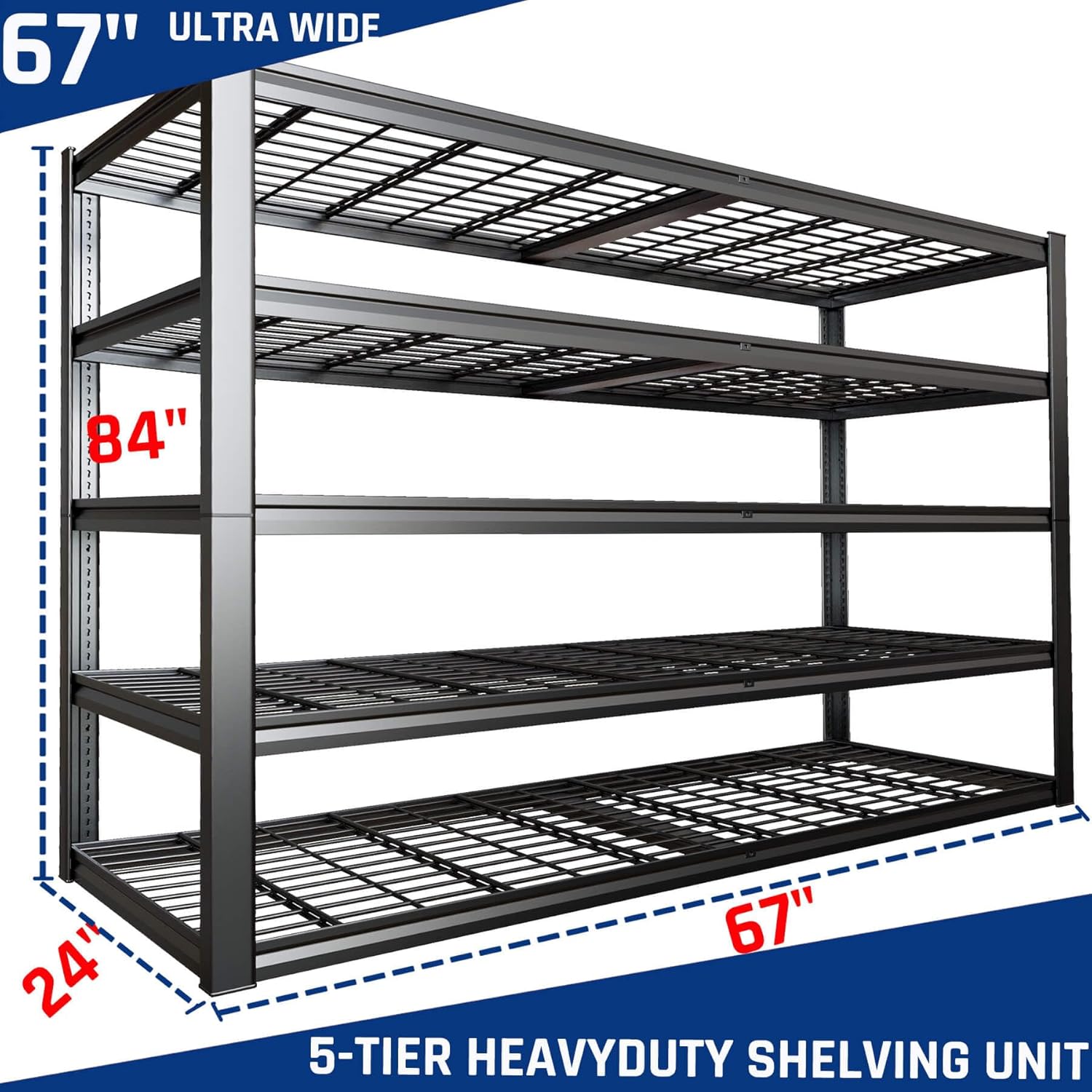 67" W Garage Shelving Heavy Duty, 67" W x 24" D x 84" H, Adjustable 5 Tier Metal Shelves, Commercial Metal Shelf Rack, Industrial Shelving
