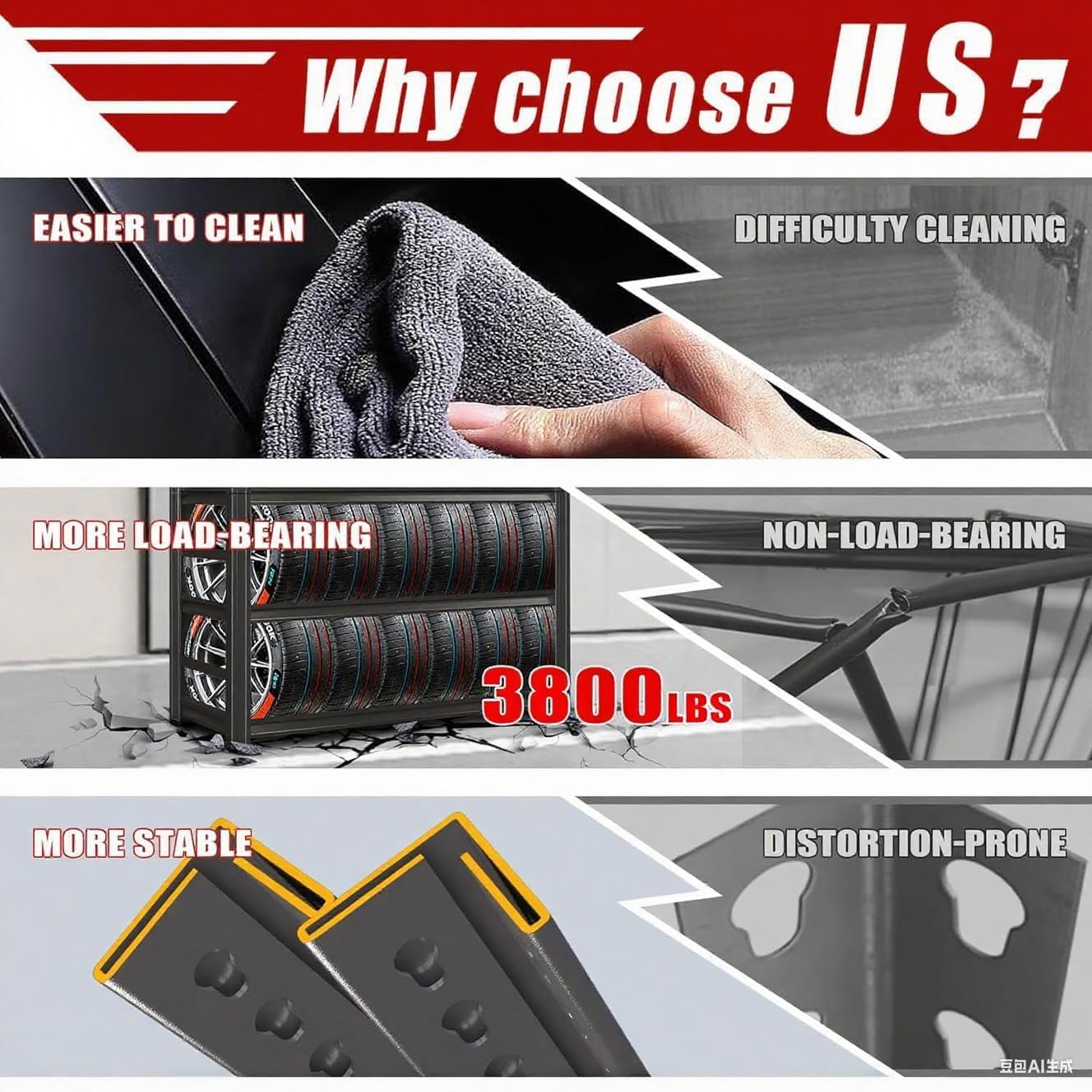 - 【Heavy-Duty Steel Construction】Built with high-quality cold-rolled steel, this garage shelving unit features thickened uprights and cross beams for exceptional stability. The scientific frame design evenly distributes weight, eliminating concerns about shifting or bending—unlike flimsy plastic or wooden storage shelves. With a 3800lb capacity, this metal shelving system is the ultimate solution for garage storage