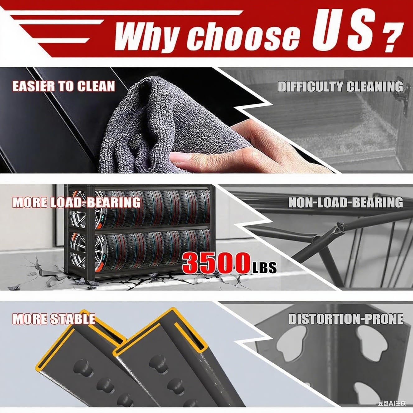 - 【Heavy-Duty Steel Construction】Built with high-quality cold-rolled steel, this garage shelving unit features thickened uprights and cross beams for exceptional stability. The scientific frame design evenly distributes weight, eliminating concerns about shifting or bending—unlike flimsy plastic or wooden storage shelves. With a 3500-lb capacity, this metal shelving system is the ultimate solution for garage storage