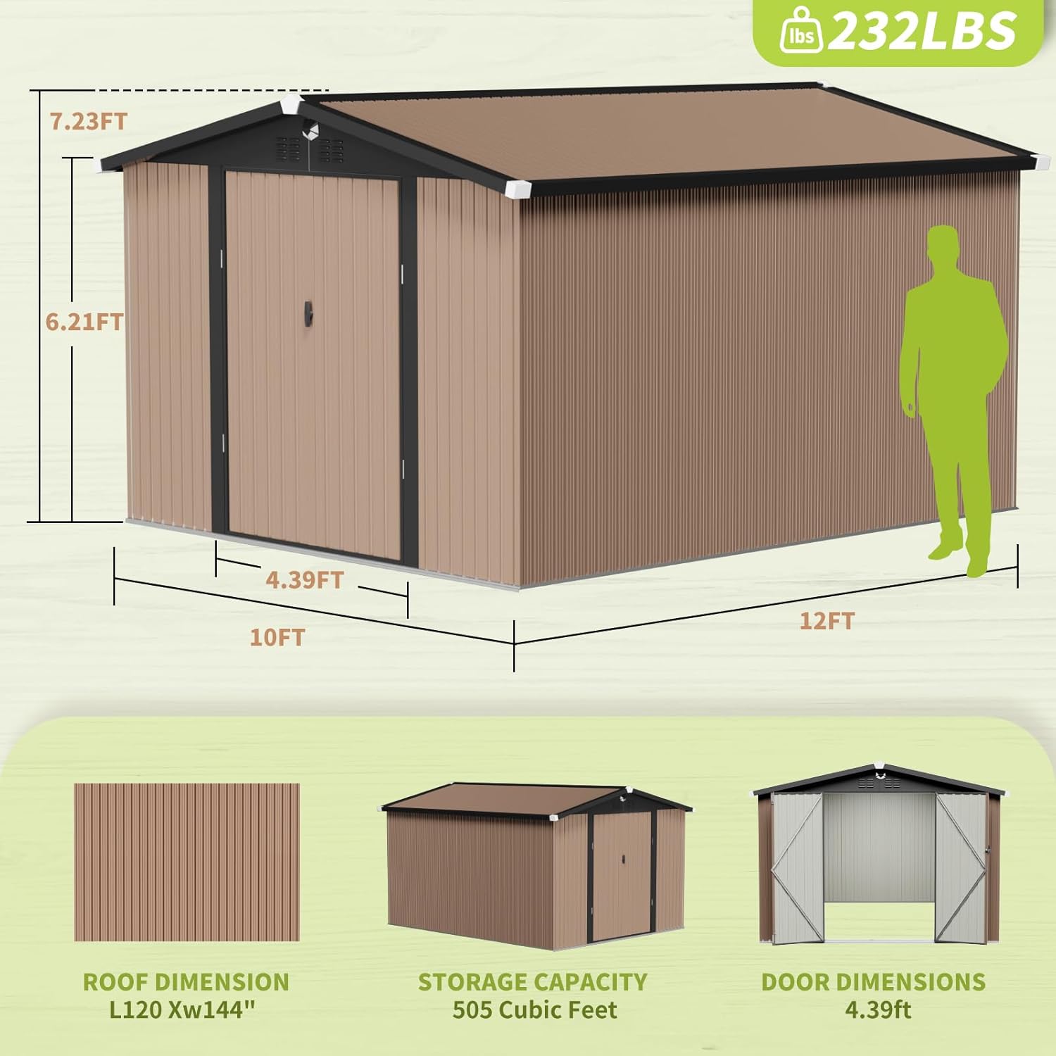 - 【Extra Spacious Shed】: Compared to traditional storage sheds available in the market, the 10x12 FT(120"L x 145"W x 86.61"H) outdoor storage building provides a larger area for storage, allowing you to accommodate everything you want to put away. No matter what purpose you intend to use it for, this will be your ultimate choice.