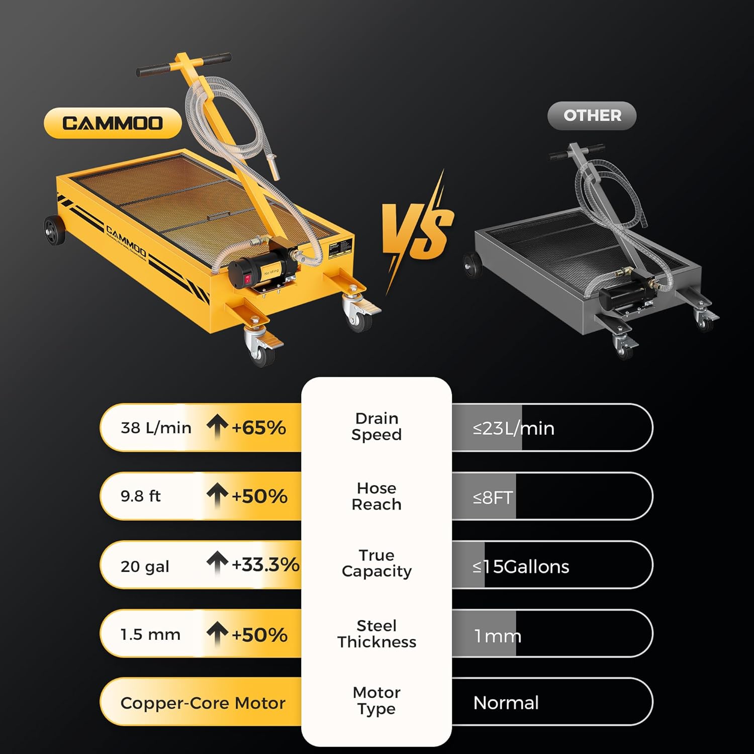 - High Capacity:Oversized 35.4" x 19.7" x 6.7" steel tank delivers a verified 20 gallons and provides a bigger footprint than standard oil drain pans so shop owners, fleet managers, farmers and DIYers can drain a full-size pickup, two RVs or four sedans in one go with less lifting, fewer trips to the recycler and more time for paid jobs. It works with all common waste oils (motor, hydraulic, etc.)—gasoline explicitly excluded.
