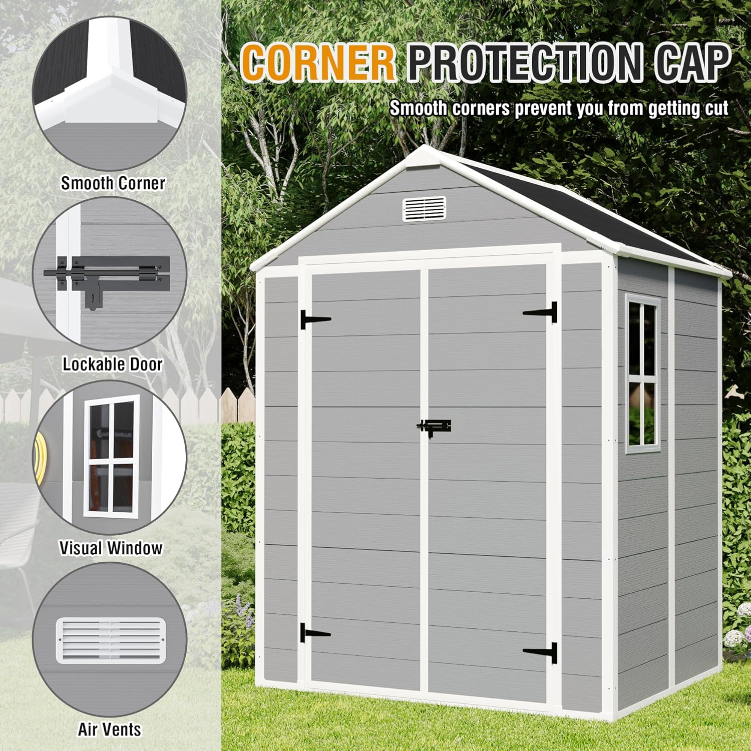 6x5 FT Outdoor Storage Resin Shed with Floor, Waterproof Plastic Garden Tool Shed with Windows, Vents & Lockable Door and Sloped Roof, Easy to Assemble Bike Shed for Patio, Backyard, Lawn, Grey