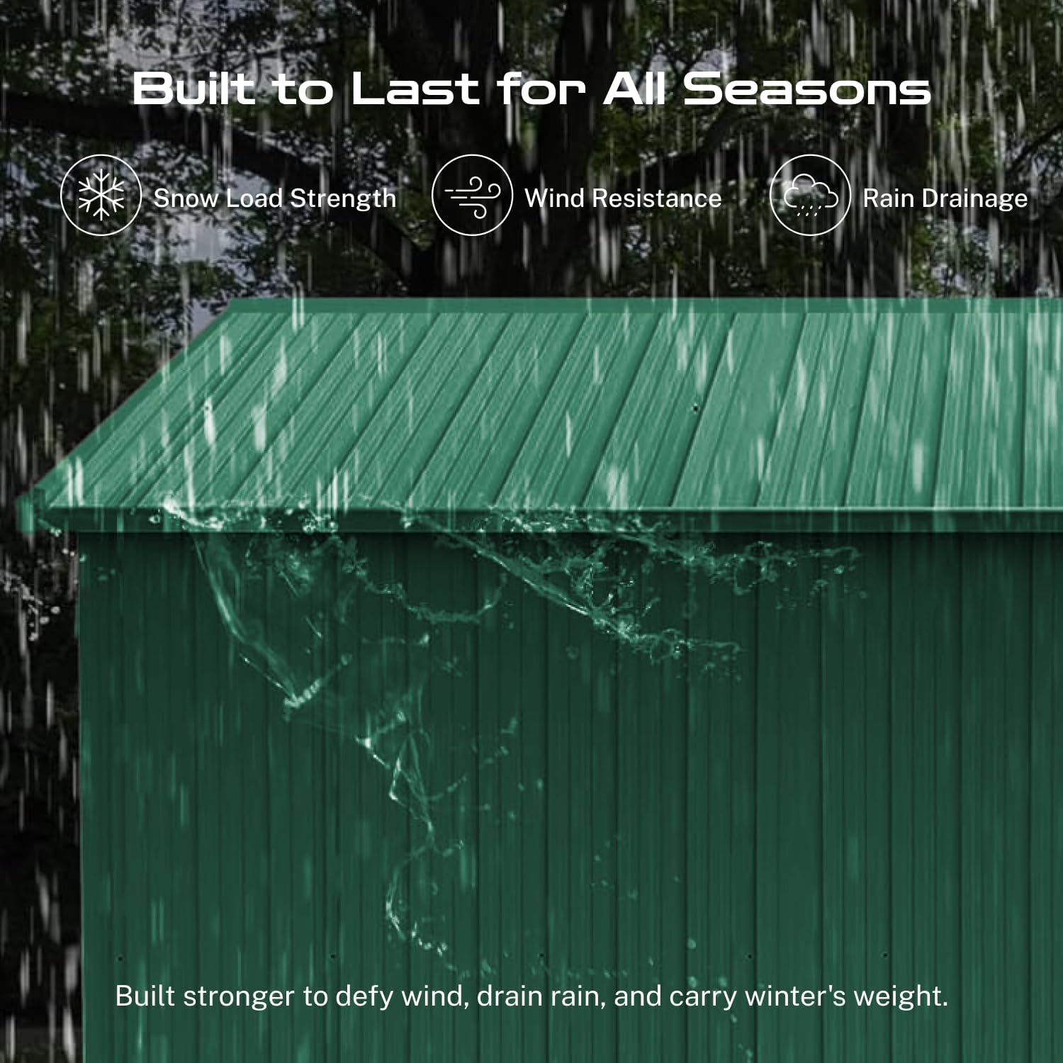 - β [Sloped Roof for Superior Weather Protection] Designed for real-world conditions, the efficient sloped roof system guarantees optimal rainwater drainage, preventing damaging pooling and leaks. This key feature in our storage buildings and sheds clearance design minimizes maintenance and ensures your tools, equipment, and belongings stay consistently dry inside