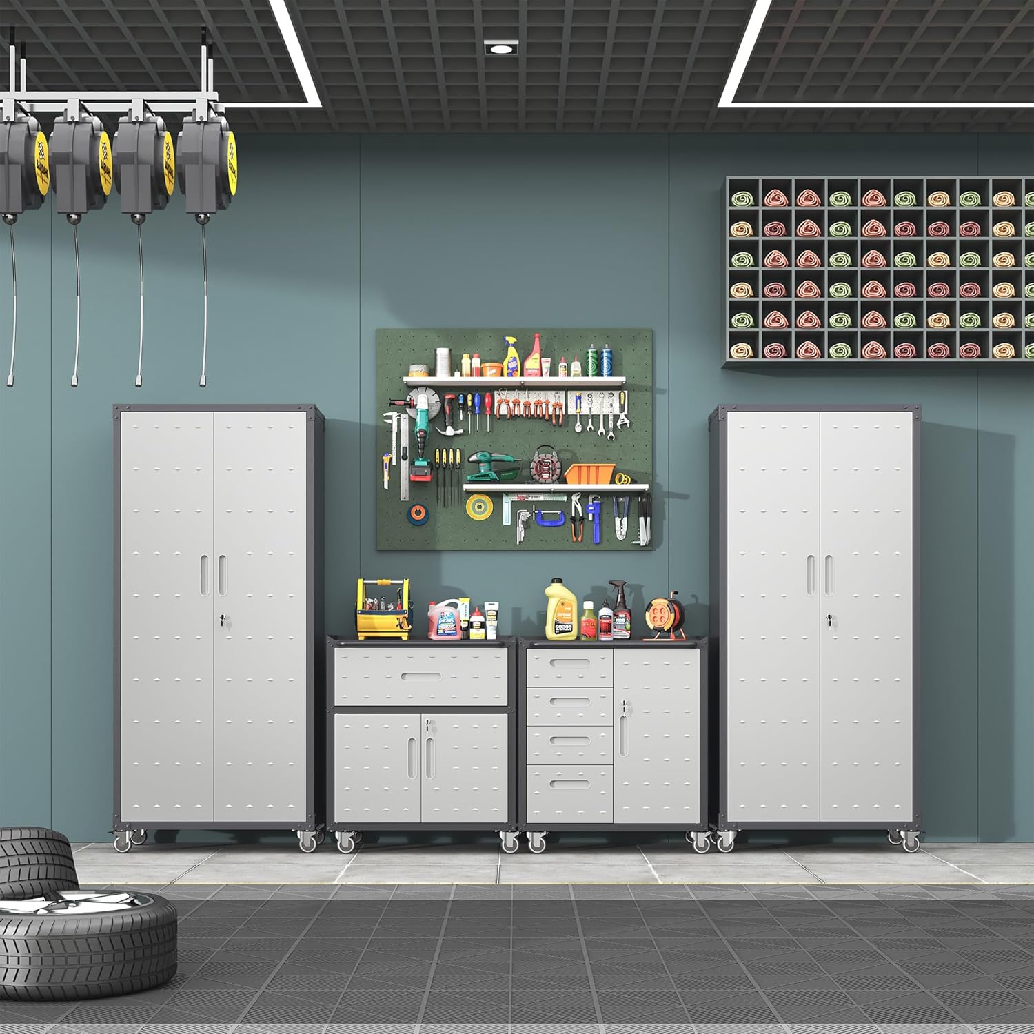 Metal Tool Cabinet,Garage Storage Cabinet System,Wall Cabinet & Locking Rolling Tool Cabinet with Doors and Adjustable Shelves,Steel Tool Cabinets for Home,Office (4 Pcs-StyleB, Black & Grey)