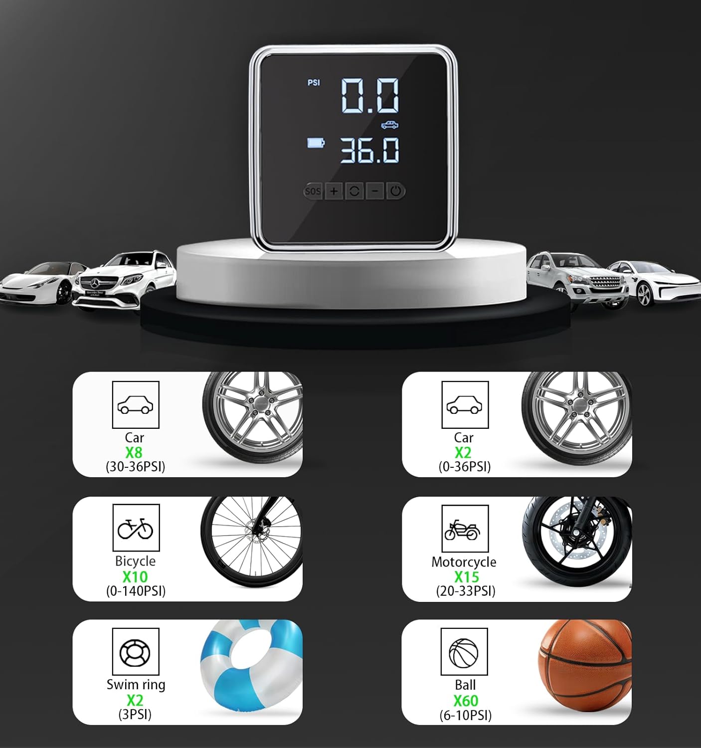 - Automatic Tire Pressure Detection Function & Smart Auto-Shutoff Function: When the inflation pump is connected to the tire, the screen automatically displays the current tire pressure value.Press the "Start" button and the air compressor portable will automatically inflate according to your preset target pressure. When the set pressure value is reached.it will automatically stop inflating.Avoiding any risk of over-inflation.and 4 inflation units (PSI, Bar, kPa, kg/cm²) for you to choose.