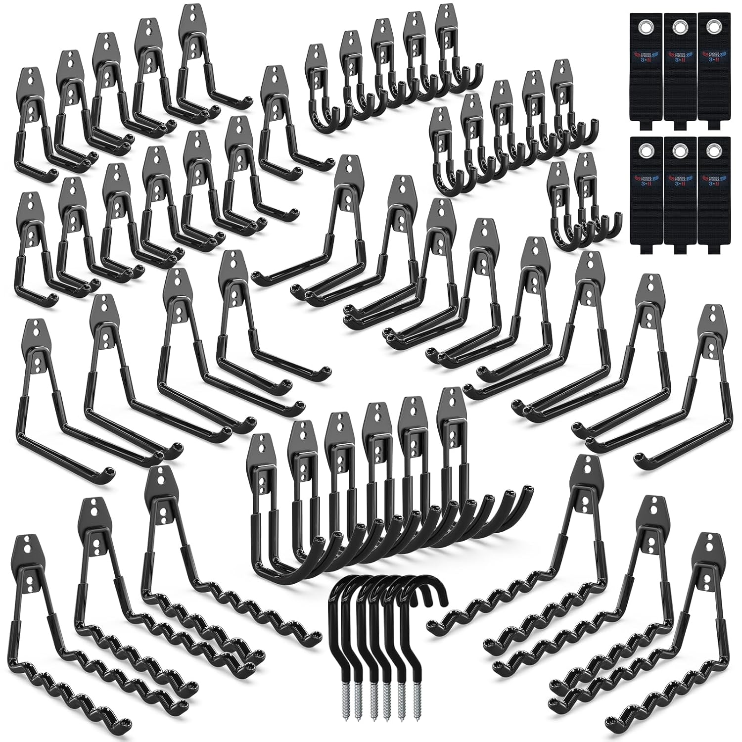 - Utility Hooks for Garage Hooks Bulk Set: 6 large size extension cord organizers and 60pcs garage wall hooks in 7 different sizes:6 large garage wave hooks,6 large U type garage hanging hooks, 6 medium U type heavy duty garage hooks, 12 small U type utility hooks, 6 medium J type tool hangers and 12 small J type ladder hangers,6 bike hooks for garage wall.All the screws and anchors included,multi-functions in one set of utility hooks for garage