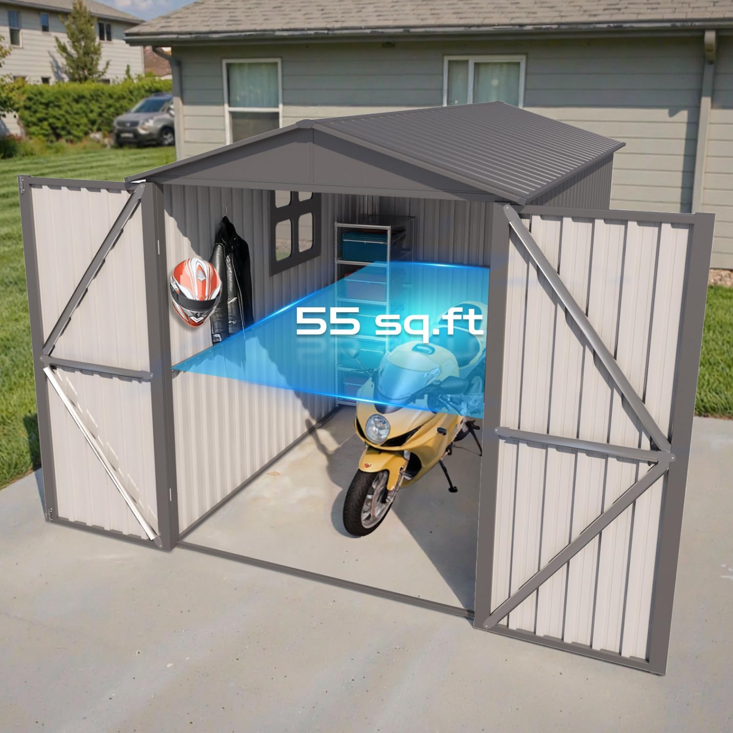- [Fireproof & Anti-Theft] Steel motorcycle storage sheds deliver unmatched fire resistance and a tamper-proof lock system. This heavy duty vehicle shed safeguards bikes, tools, or heirlooms with dual-layer security—ensuring your valuables stay protected around the clock