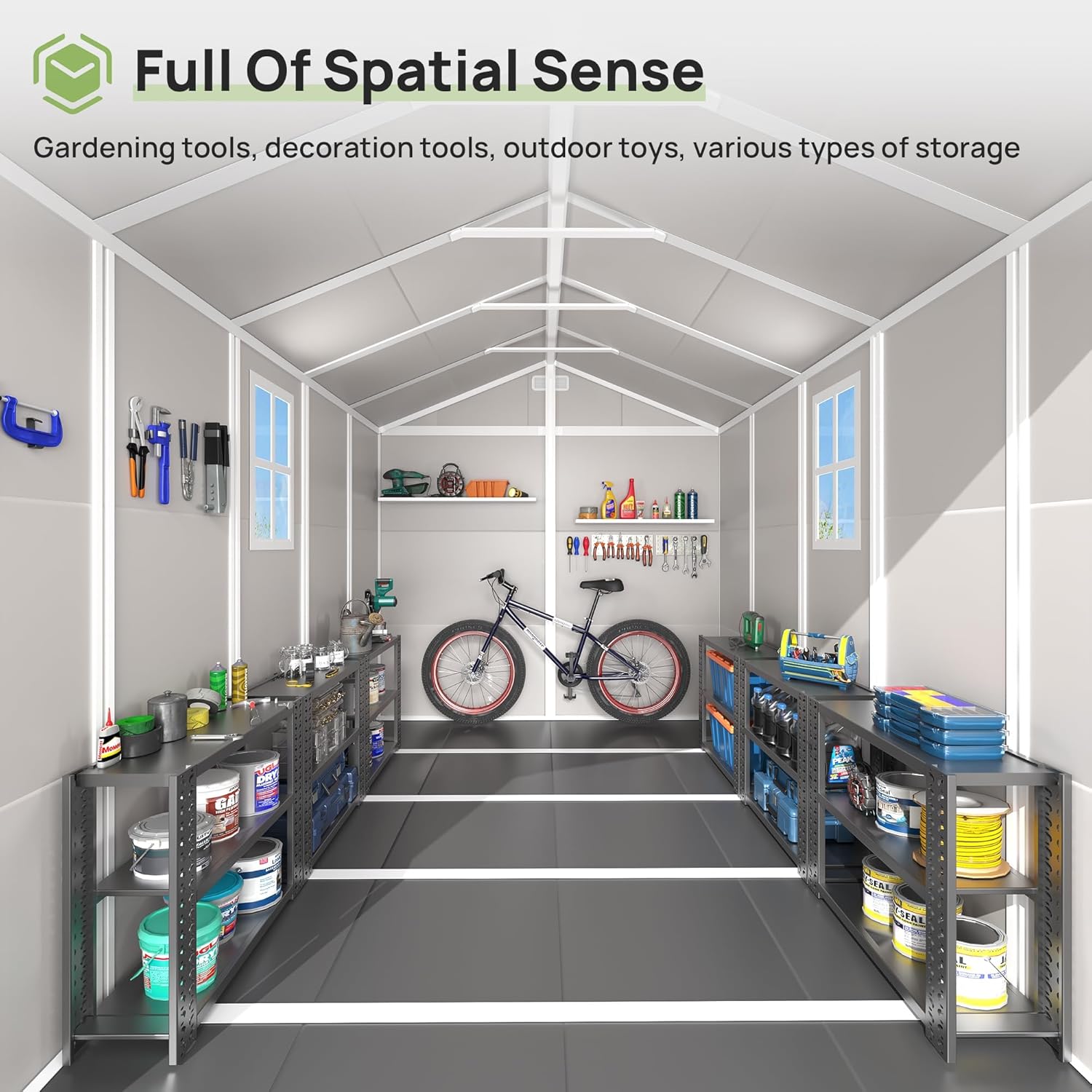 Resin Outdoor Storage Shed with Floor, 8x10.5 FT Plastic Garden Shed with Lockable Door & Window for Bike, Garbage Can, Lawn Mower, Bedge