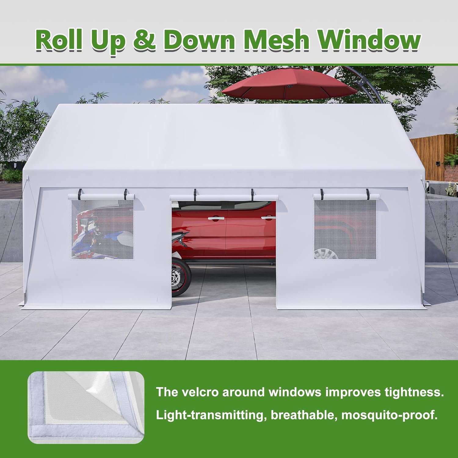 - 【Spacious 13x20 ft All-Purpose Garage】This heavy-duty carport provides 260 sq.ft. of sheltered space, ideal for storing cars, trucks, boats, trailers, or tools. The large footprint also makes it perfect as a backyard event tent or outdoor storage shelter