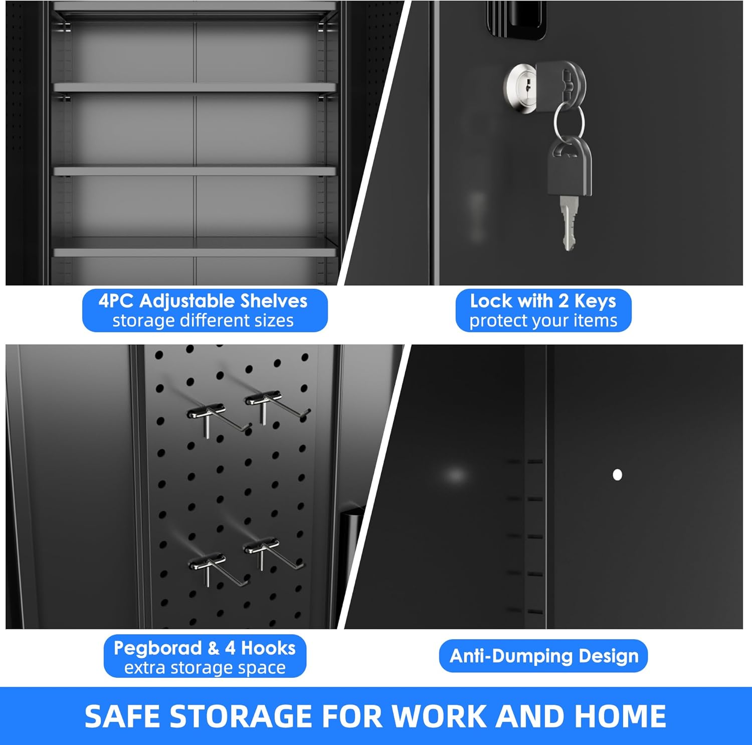 - Ample & Flexible Storage Solutions: Maximize organization with four adjustable shelves (customizable height) and pegboard on both doors, paired with 4 hooks for hanging tools, accessories, or gear. This design of the garage storage cabinet adapts to your needs, whether storing heavy-duty items or small essentials;
