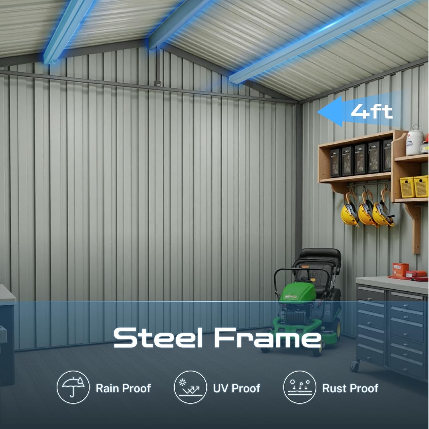 - β [Sloped Roof for Superior Weather Protection] Designed for real-world conditions, the efficient sloped roof system guarantees optimal rainwater drainage, preventing damaging pooling and leaks. This key feature in our storage buildings and sheds clearance design minimizes maintenance and ensures your tools, equipment, and belongings stay consistently dry inside