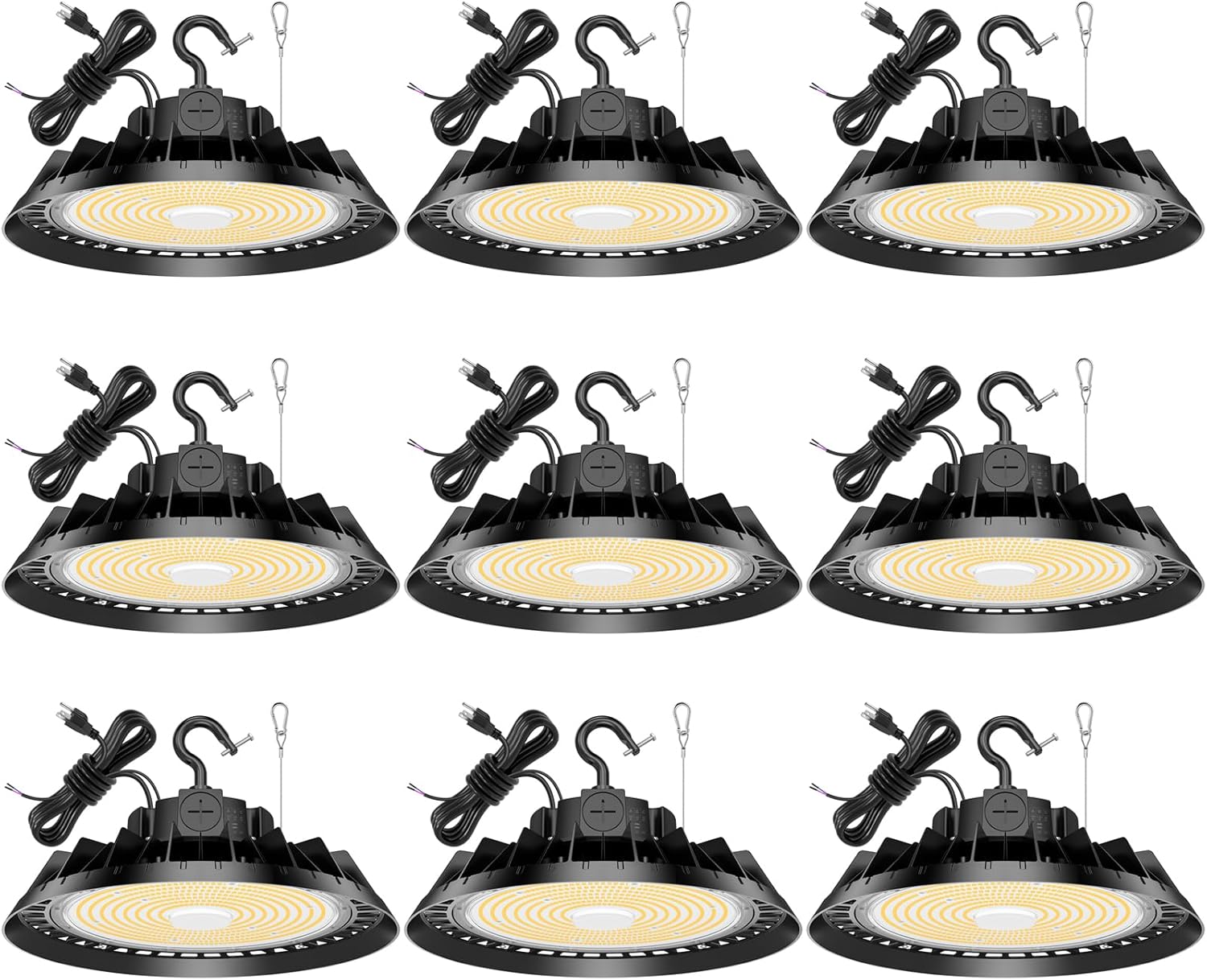 9Pack LED High Bay Lights, 200W UFO High Bay LED Shop Lights, 30000LM Adjustable CCT(5700K 5000K 4500K) & Power(200W 150W 100W), 0-10V Dimmable, 5' Cable Plug, IP65 Waterproof, ETL & DLC Listed