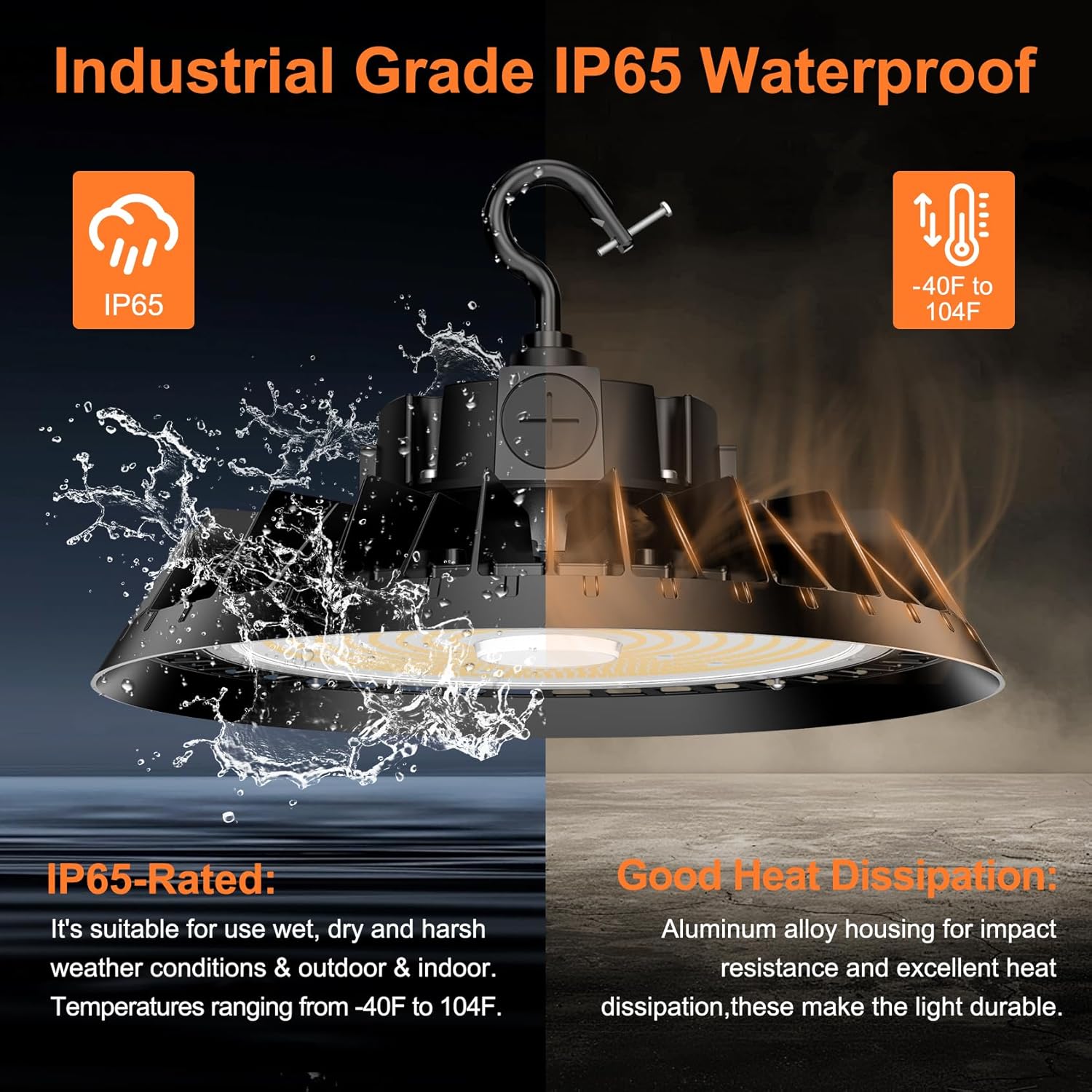 - Super Waterproof & Excellent Heat Dissipation: Upgraded Led High Bay Light is made of aluminum heatsink, and excellent hollowed-out for heat dissipation high-temperature resistant and corrosion resistant, and featuring IP65 certified water resistant and dustproof, suitable for damp places or other harsh environments.Whole light has ETL and DLC Listed