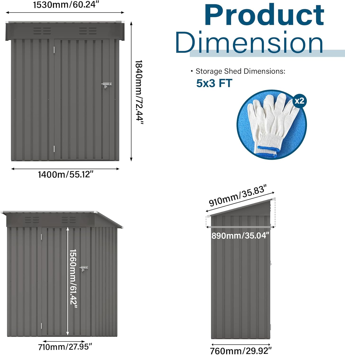 - MAXIMUM STORAGE, MINIMAL FOOTPRINT: ly, a solution for cluttered balconies and tight corners; this 5x3 FT small shed is the ultimate space-saver, transforming unused nooks into highly efficient storage zones; The smart, vertical design of this patio storage cabinet provides ample room for long-handled garden tools, cleaning supplies, and sports equipment without eating up your valuable outdoor living area