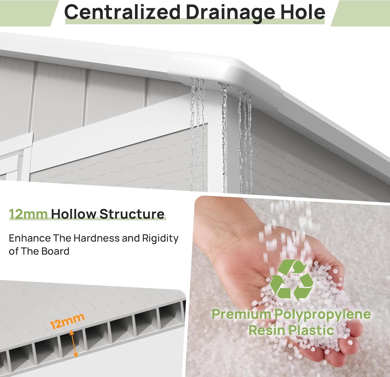 - Double-wall stable design: Tough, double-wall resin construction with impact-resistant floor for long-term durability. The overlapping wall panels are water and moisture resistant for worry-free use in all weather conditions,Weather-resistant, waterproof and UV protected will not peel, rot or rust.(Max Wind resistant grade: 6 (24-30 mph); Maximum snow thickness tolerance: 6 inches)