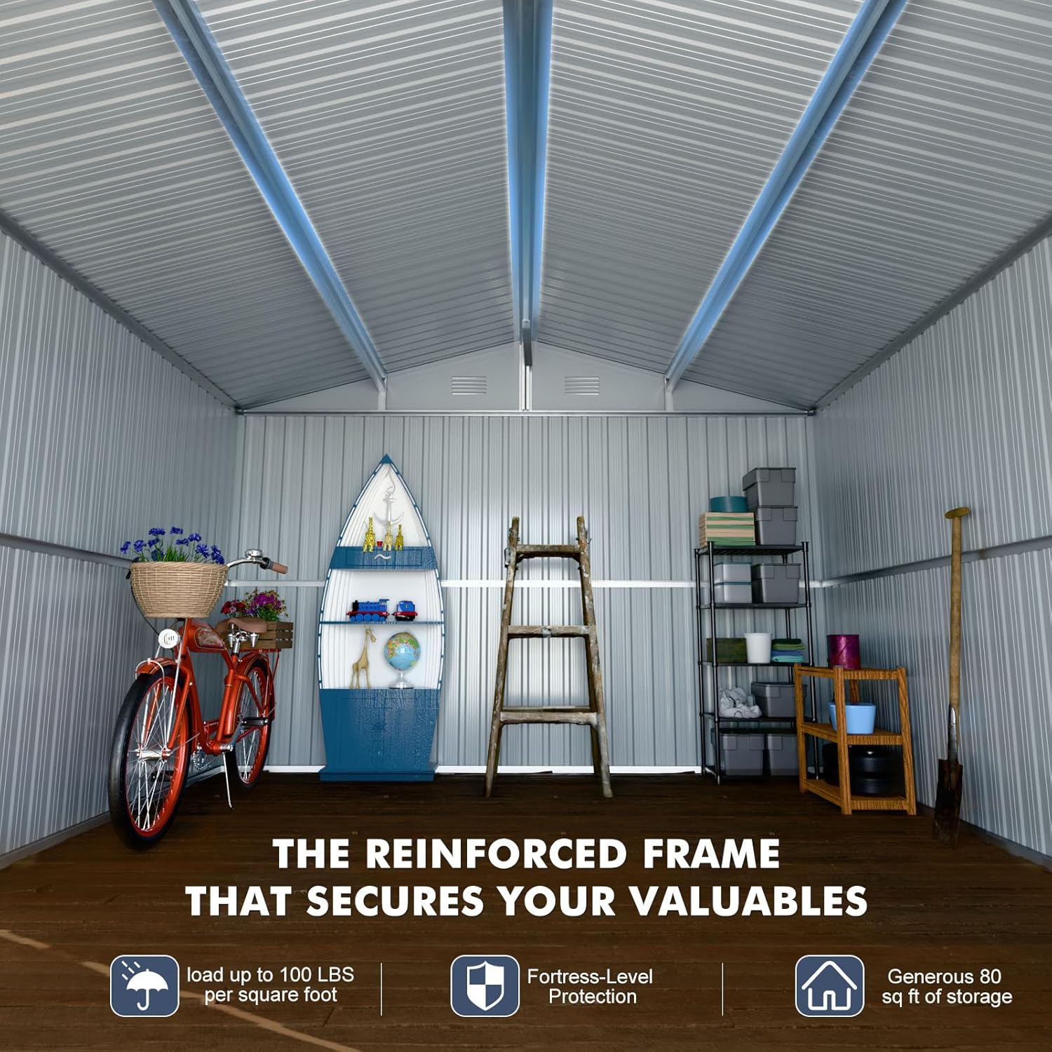 - Introducing the Ultimate Durable and Sturdy Storage Solution: Elevate your outdoor storage game with our top-of-the-line storage shed. Constructed with a sturdy frame and heavy-duty galvanized steel, this shed is a testament to durability. Engineered to brave the elements, it guarantees watertightness and long-lasting resilience. The fortified metal roof and wall panels offer superior stability, ensuring your possessions are sheltered securely.